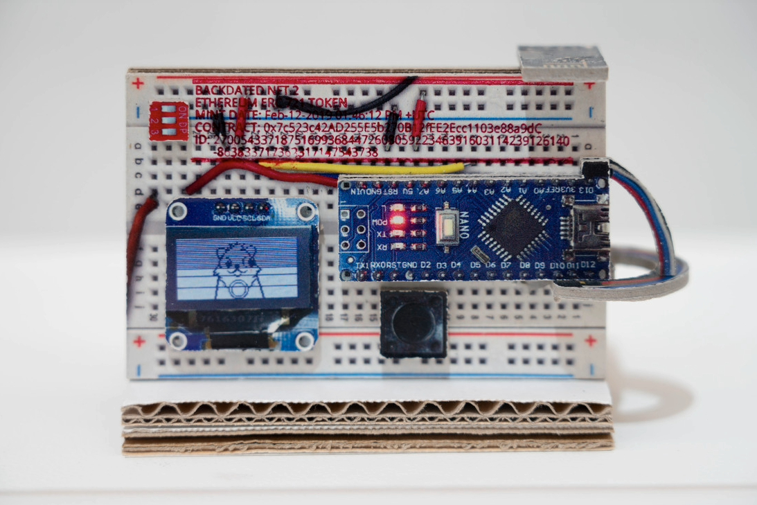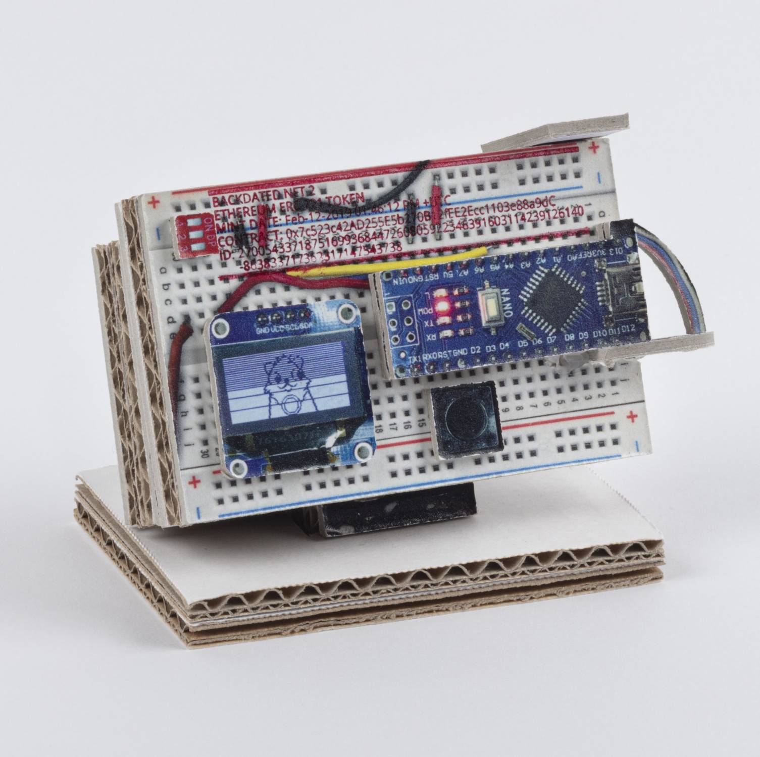 The cardboard Cryptokitty wallet replica is tethered to an old NFT that was minted in 2019. Rubber-stamped with the details of the earlier token, then photographed, the object-image constitutes “Backdated NFT/ Cryptokitty Display Hardware Wallet Replica (Celestial Cyber Dimension),” which acts as a parasite within the realm of emergent crypto art. In hijacking an existing token by replacing its image, the work exposes a technical reality of the format: the assets linked with many NFTs, claiming to be immutable, are in fact not stored on the blockchain, but are linked from their blockchain entry to sites on the open web, and are therefore alterable.