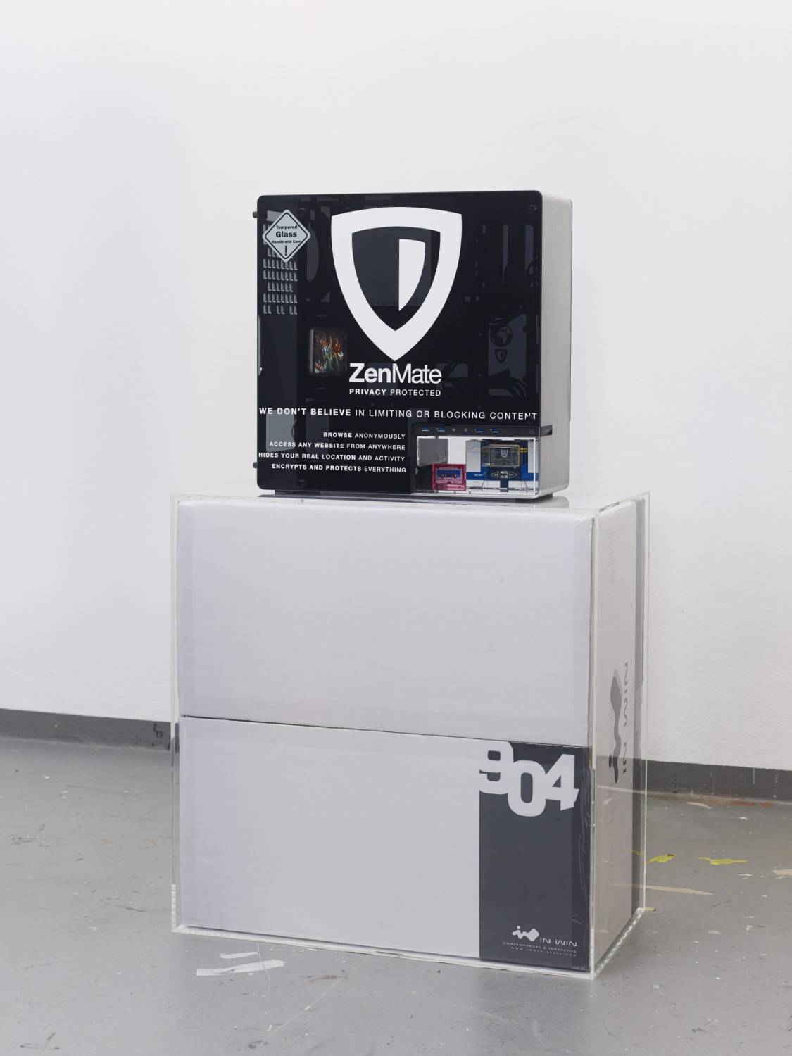 Berlin Startup Case Mod: ZenMate; 2014; custom computer case with various digital prints, Transformers MP-13 Masterpiece Soundwave toy, plexiglas, metal fittings, Samsung Galaxy Note 3 and case, Axel Springer's hy! Berlin event promotion video, packaging: 122,5×72×38cm.