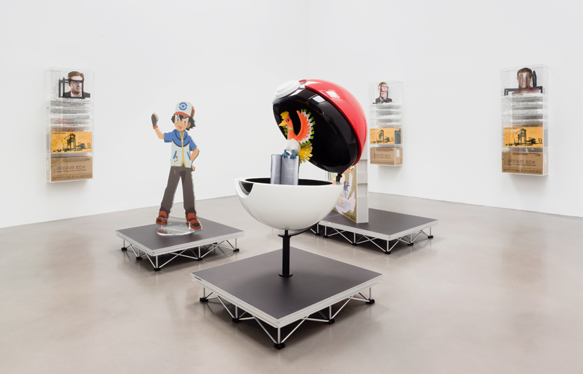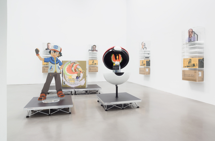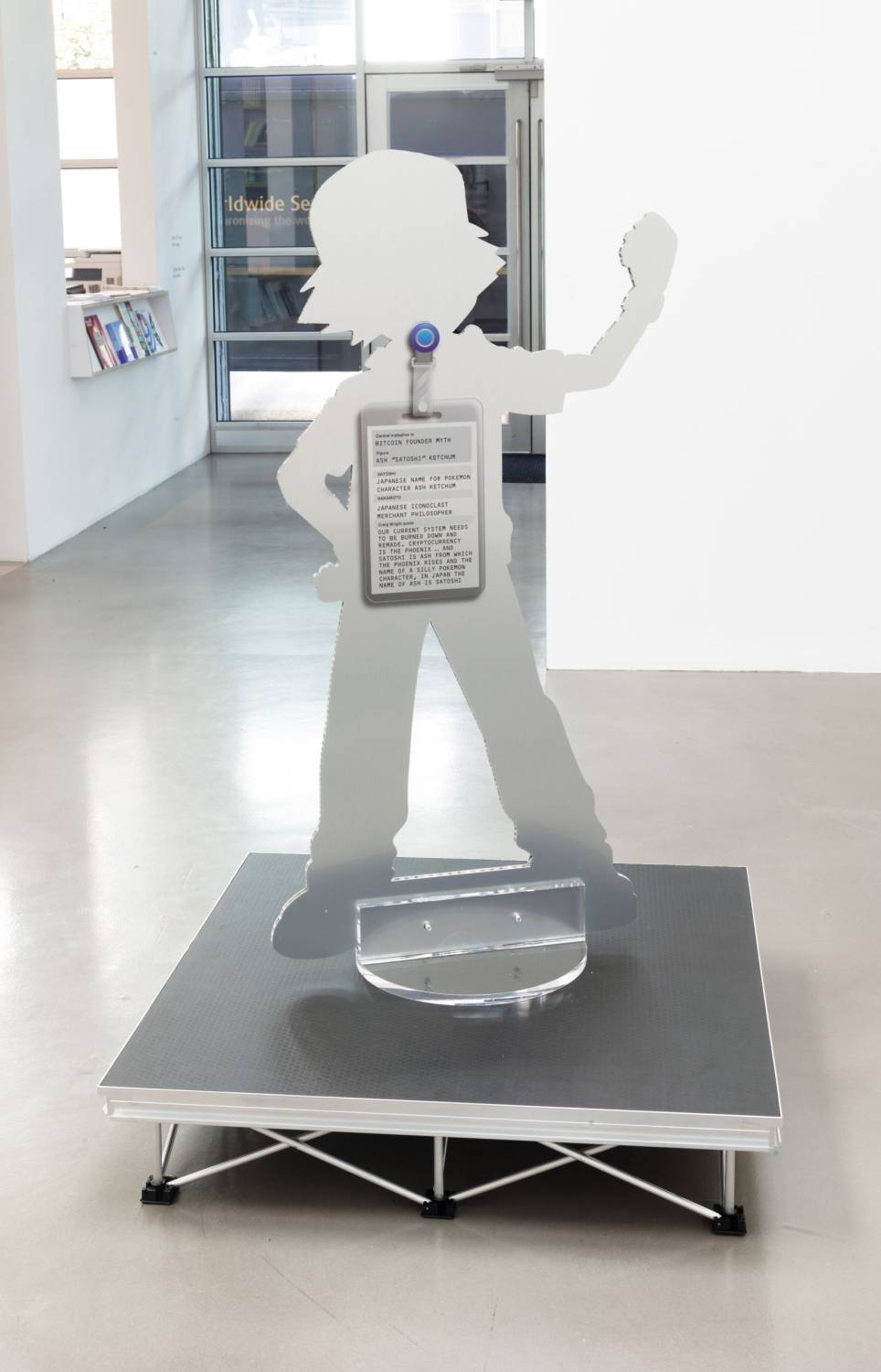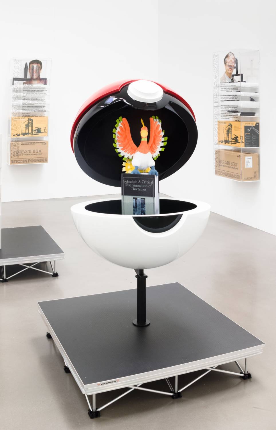 Bitcoin/Blockchain Founder Myth Oversized Pokeball Globe; 2016; powdercoated steel component on Styrofoam-core ball, Book, Plushtoy,: 90×85×80cm.