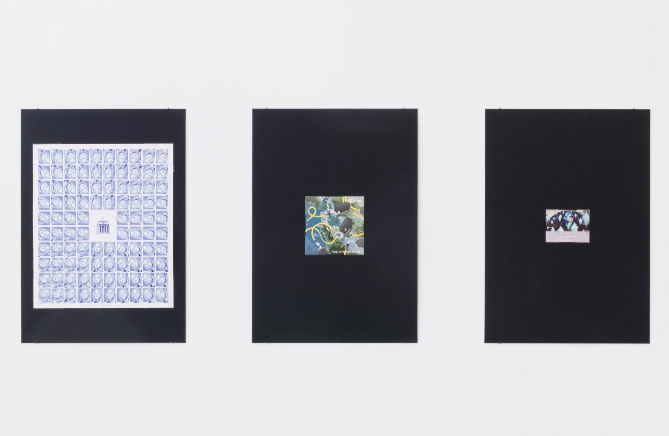 Blockchain company postage stamp designs: Digital Asset, 21Inc, Ethereum [with Linda Kantchev] EDITION OF 100; 2016; Custom designed postage stamps with photo mounting corners on cardboard: 60×42cm, Custom designed postage stamps with photo mounting corners on cardboard: 60×42cm, Custom designed postage stamps with photo mounting corners on cardboard: 60×42cm.