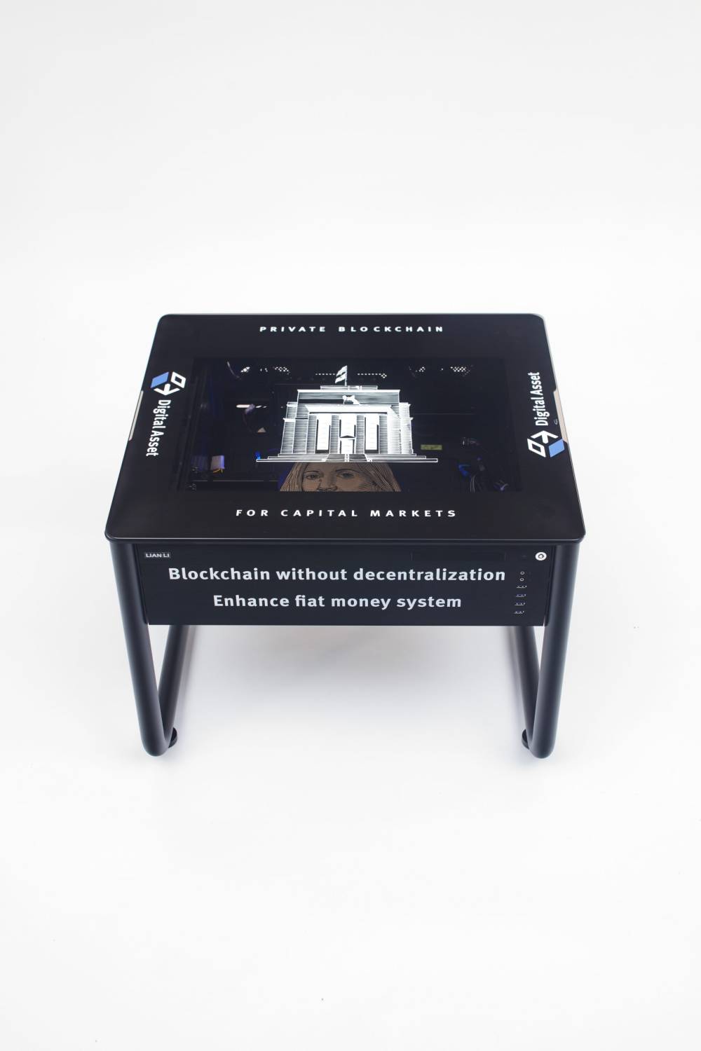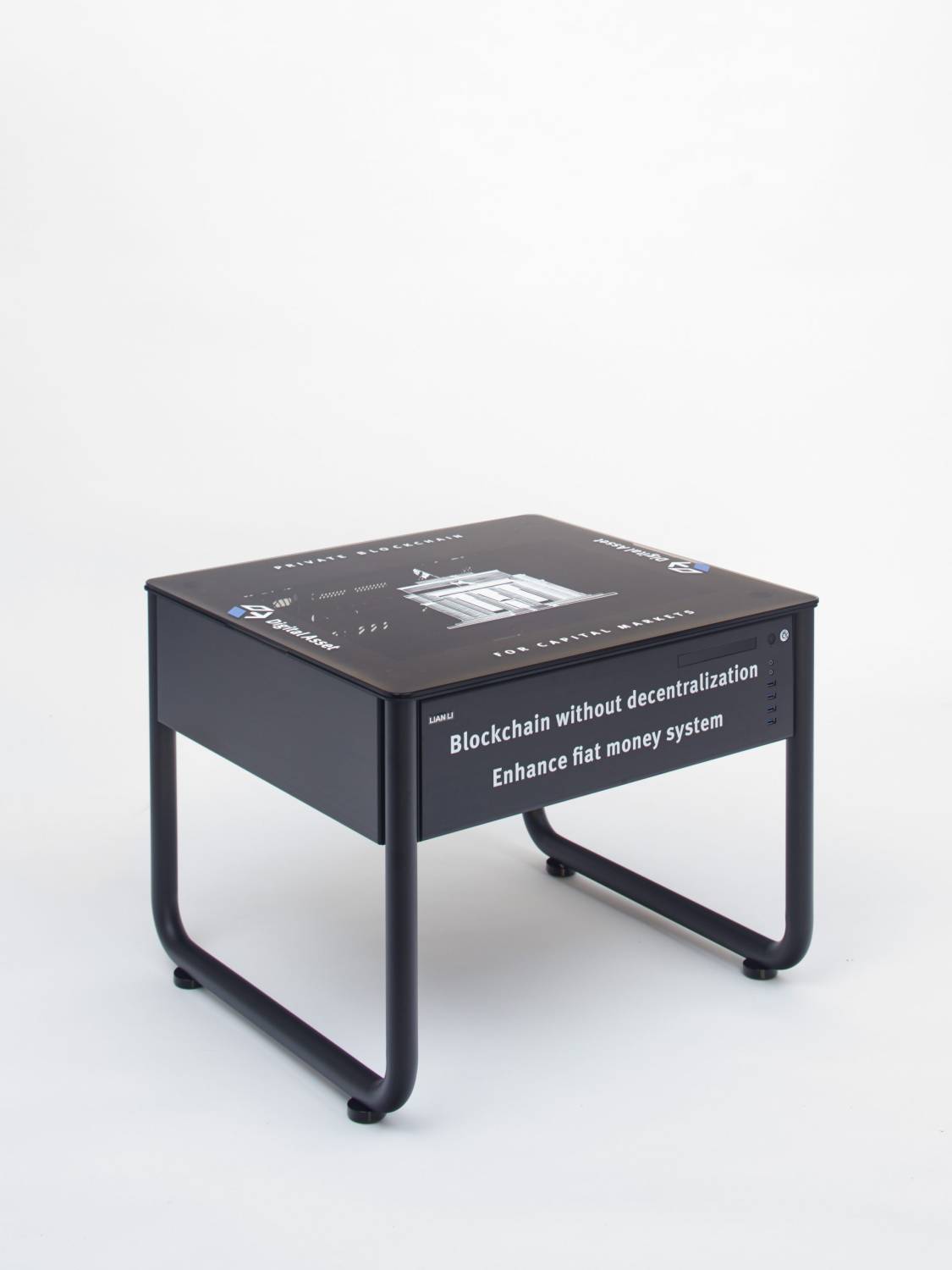 Blockchain Future State Gamer Startup Case Mod with expansion hardware: Digital Asset Individual Desk; 2016; Screen print and UV print on Lian Li DK-Q1, cumputer part, flexible LED strips, Paulmann power supply: 55×65×62cm, .