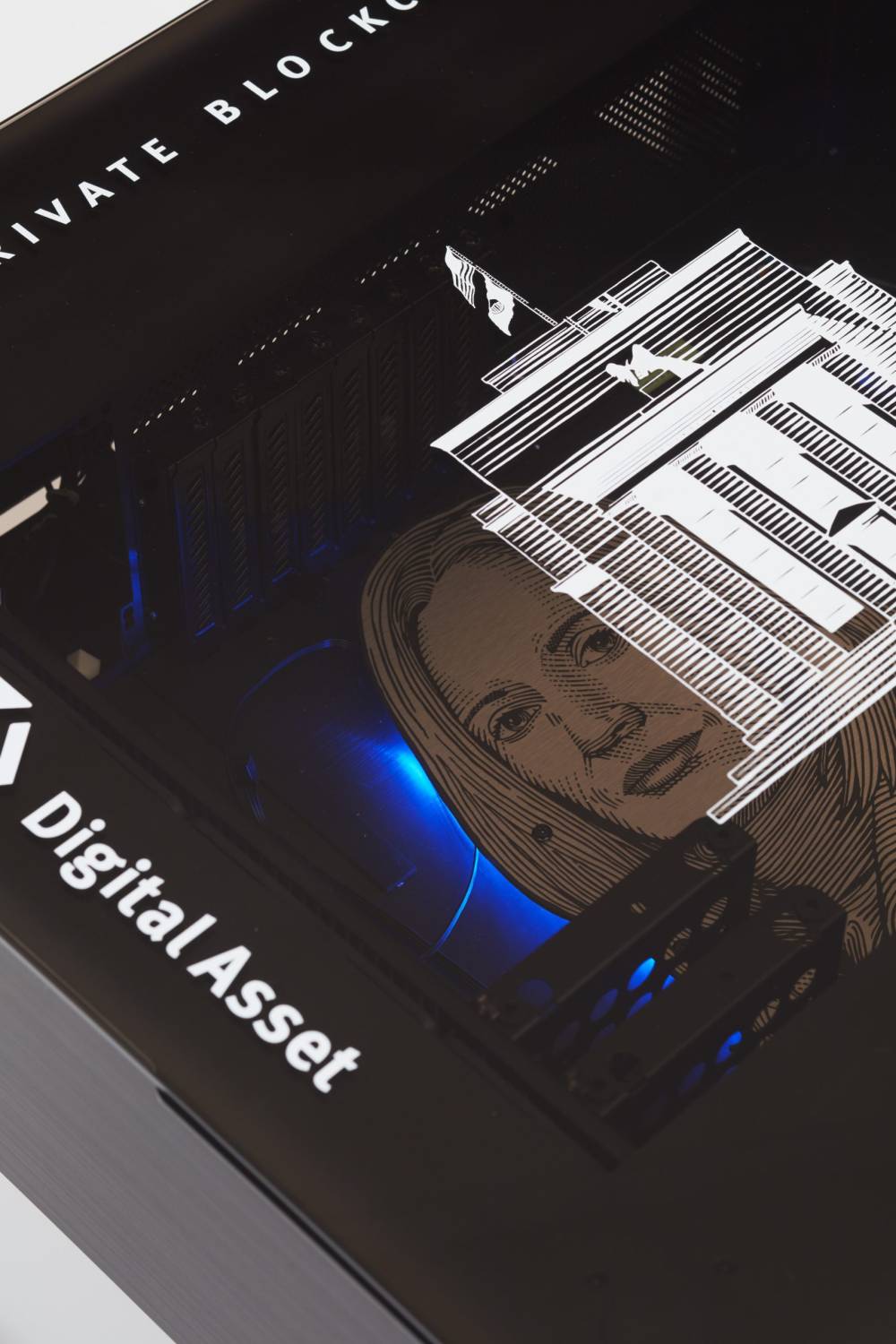 Blockchain Future States Startup Case Mod: Digital Asset; 2016; Screen print and UV print on Lian Li DK-Q1, print on Aludibond cutout, flexible LED strips, Paulmann power supply: 55×65×63cm.