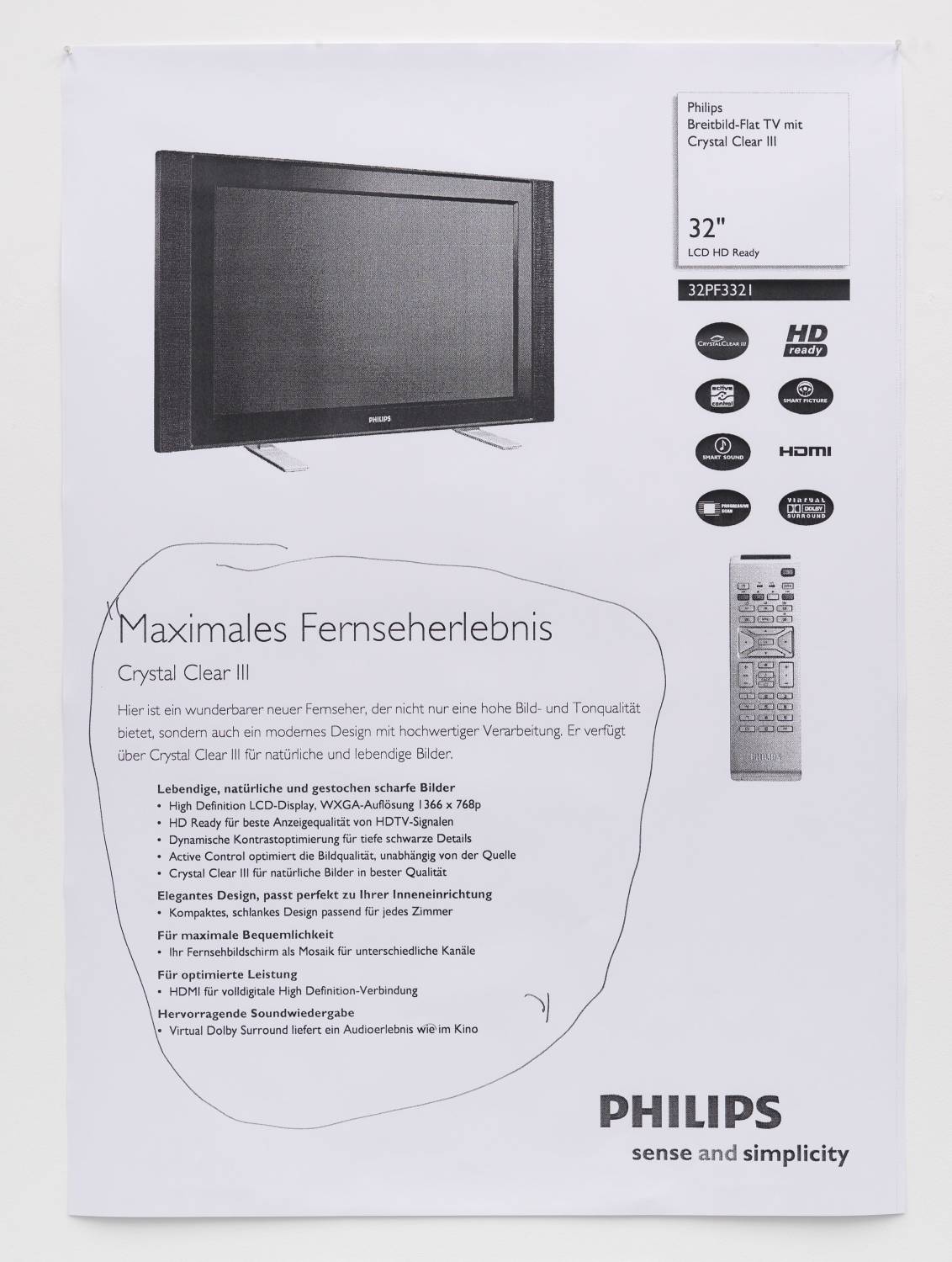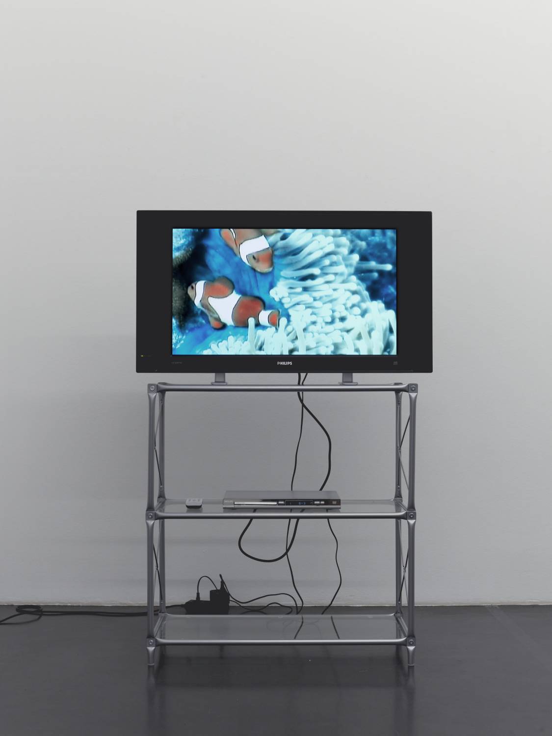 Deep Sea Monitor Philips + Underberg Drawing Philips; 2009; Philips television, shelf (glass, metal)+Underberg Drawing Philips, DVD, DVD Player und notes from script, technical data,xerox on paper: 138×92×39 cm (Philips Television); 127×91 cm (xerox paper).