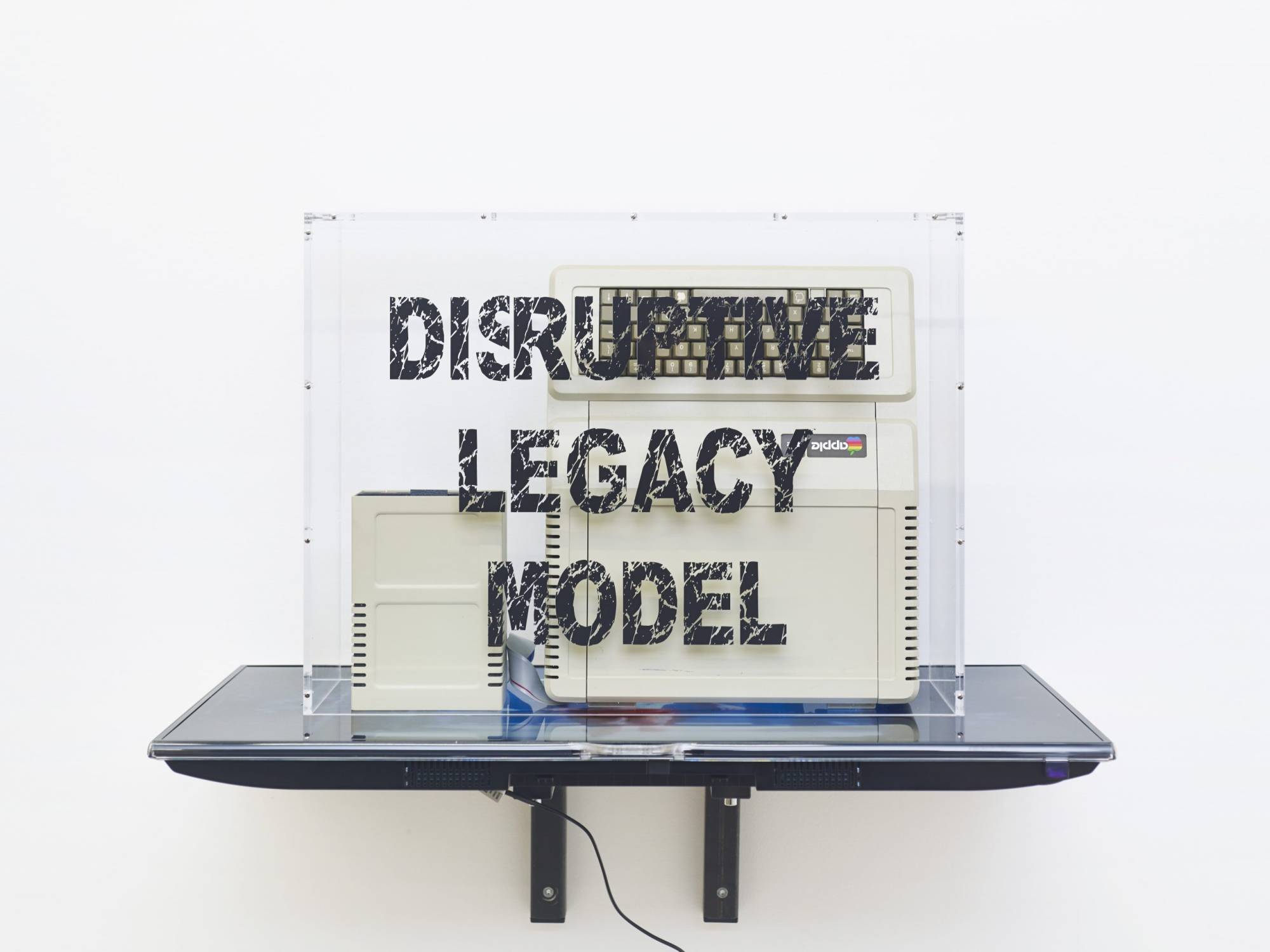Disruptive Legacy Model: Apple IIe; 2014; Apple IIe Computer (acquired in Christie’s First Byte: Iconic Technology From the Twentieth Century Online Auction – Sale 773429), custom plexiglas box with digital print, Samsung UE40F6500 SS, video on USB stick: 80×91×54cm.