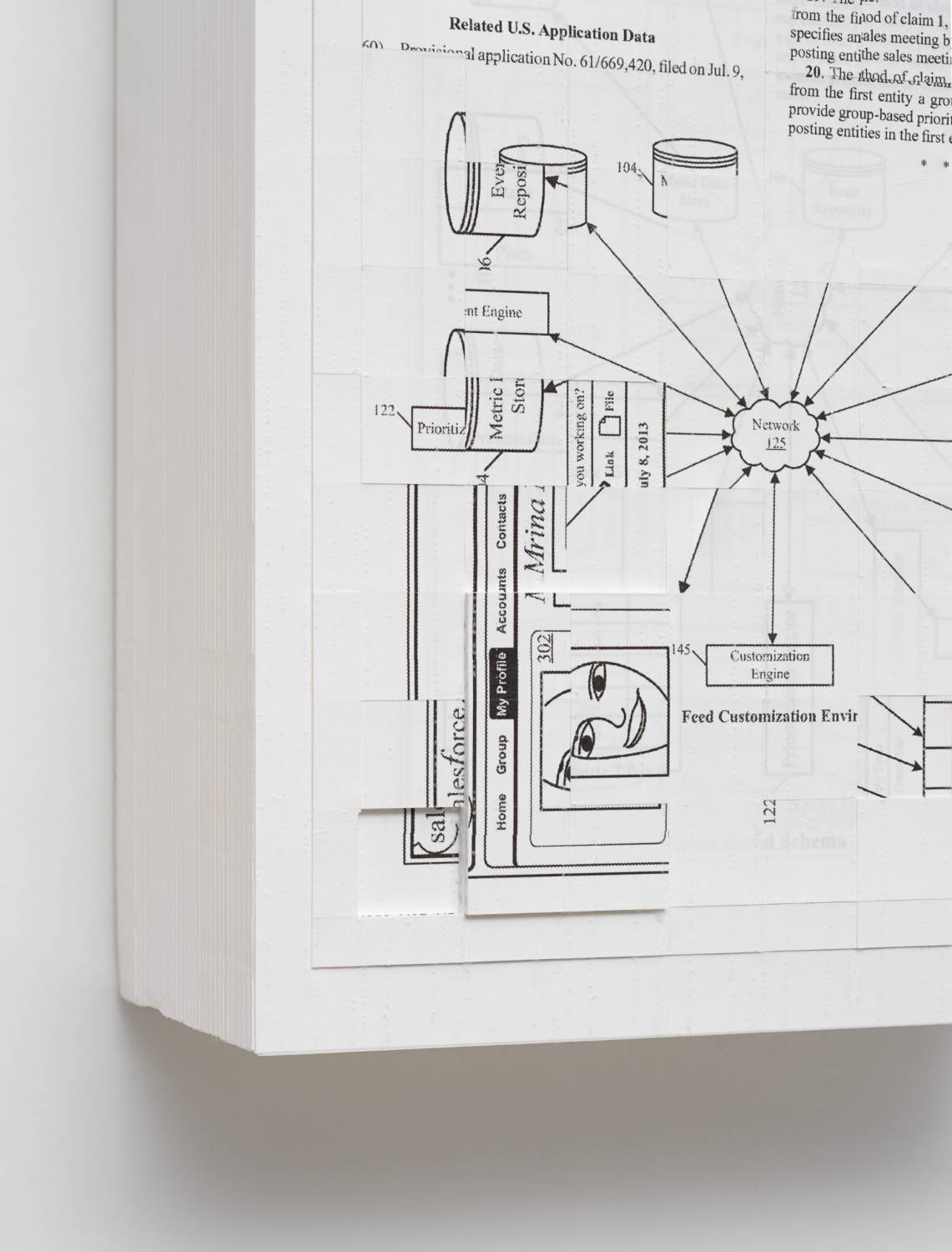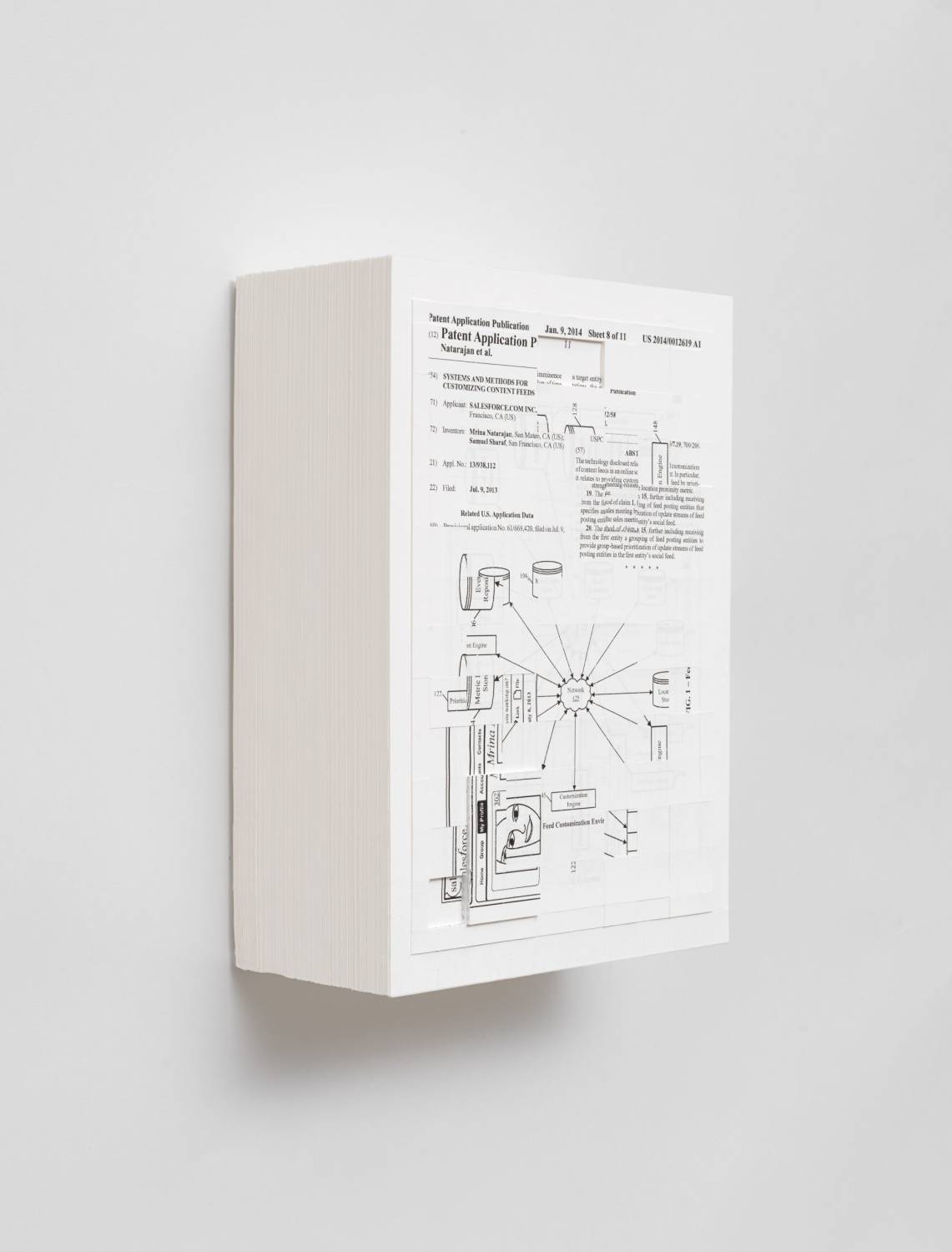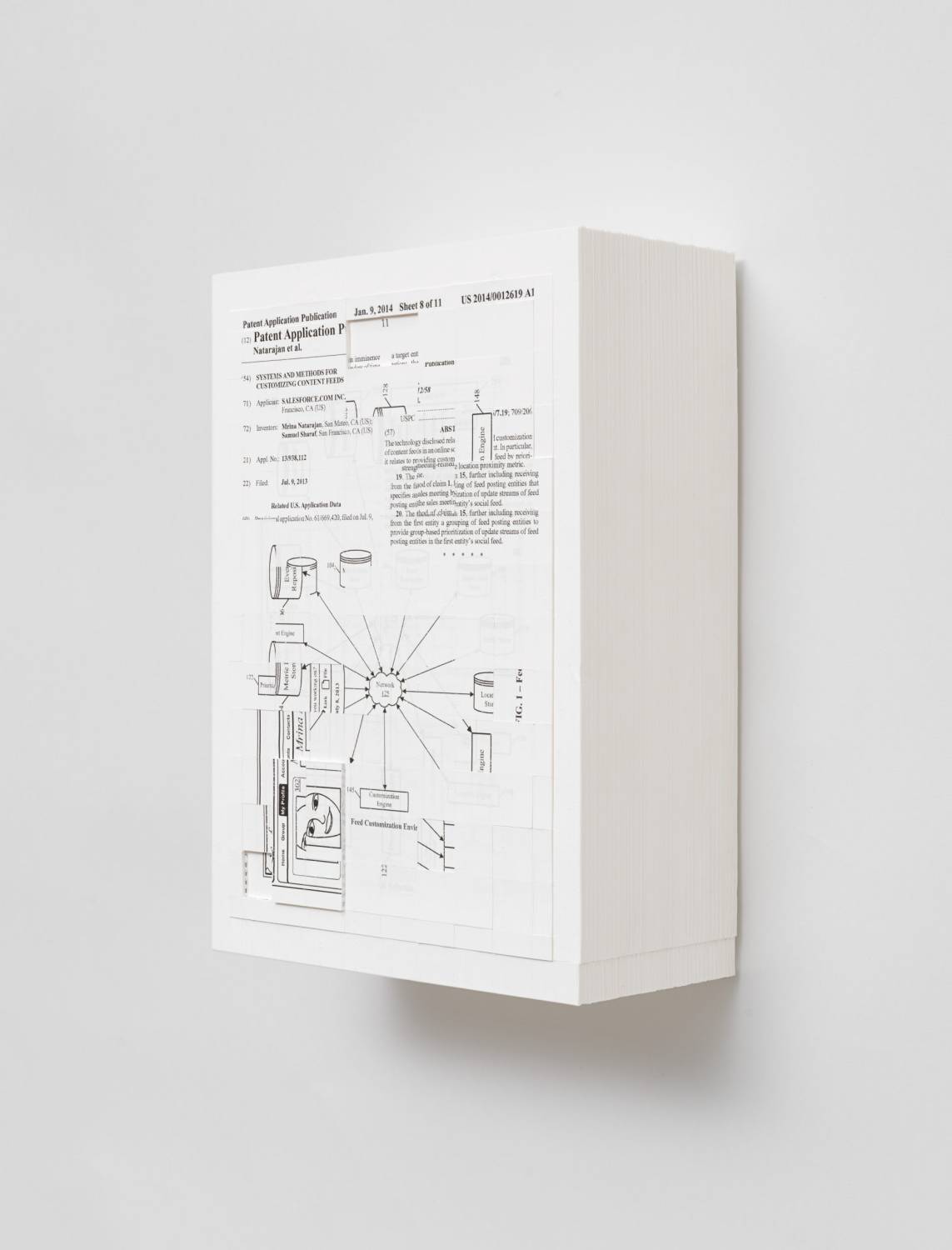 Document Relief 15 (Salesforce.com, inc patent: SYSTEMS AND METHODS FOR CUSTOMIZING CONTENT FEEDS)2019; 2019; Ink Jet Print on Archival Paper, glue, custom metal wall mount: 29,7×21×10,5cm.