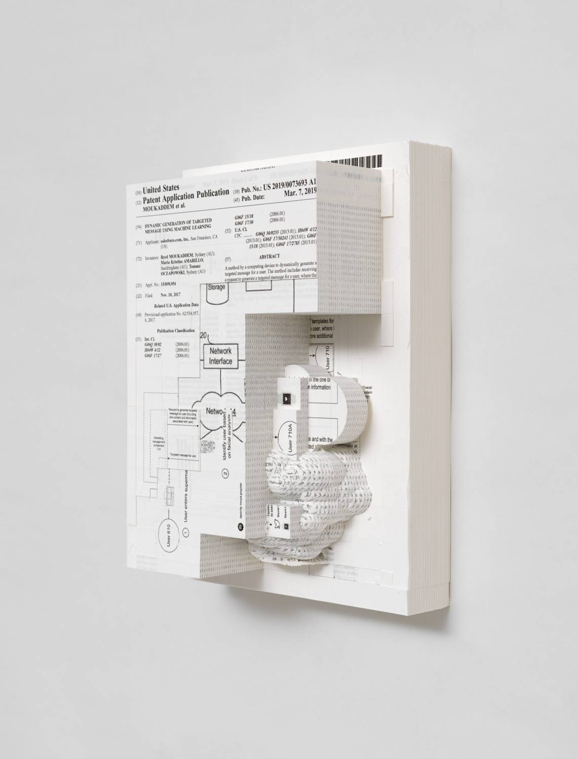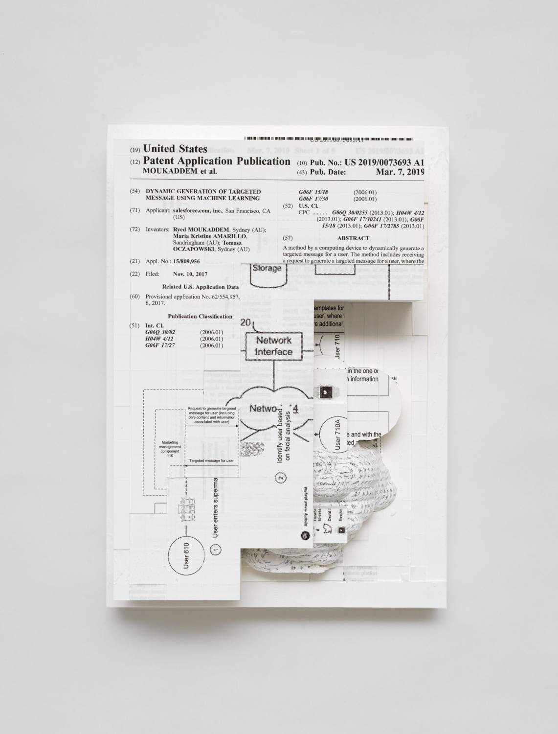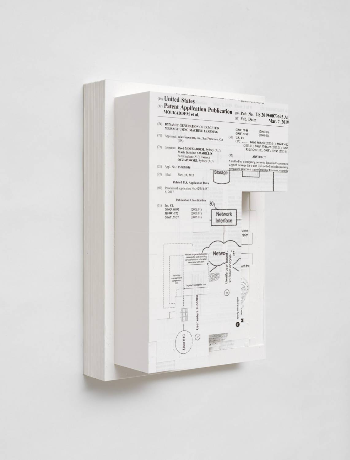 Document Relief 17 (Salesforce.com, inc patent: DYNAMIC GENERATION OF TARGETED MESSAGE USING MACHINE LEARNING); 2019; Ink Jet Print on Archival Paper, glue, custom metal wall mount: 29,7×21×11cm.
