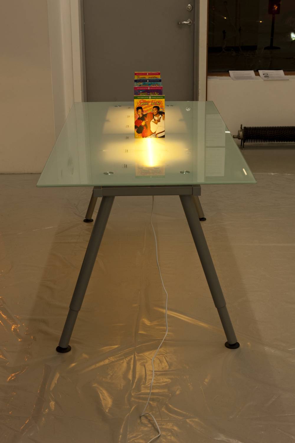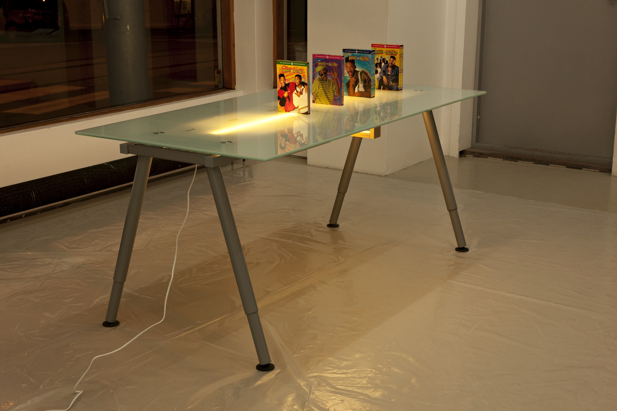 DVD Box Projection Table;2009; Broadcast art: IKEA table with glass tabletop, adhesive labels and "Fresh Prince of Bel Air" Box Sets [German version]: 80×160×71 cm / 31×63×28".