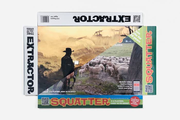 Extractor/Squatter Board Game Lid Jahresgabe Kölnischer Kunstverein; 2019; Verpackungsdruck ( im Digitaldruckverfahren ) auf eine 1,5 mm starke Wellpappe,1:1 im Format von ca. 510 x 370 mm, auf Formgeschitten die 4 Ecken freigestellt.Vereedelung im Siebdruck mit 2 Klarlack- Flächen obere Diagonal in glänzend,untere Diagonale in matt. Weißer Aufdruck mit einer leichten Haptik beim Tablet in der oberen Diagonale.: 51×37×0,2cm.