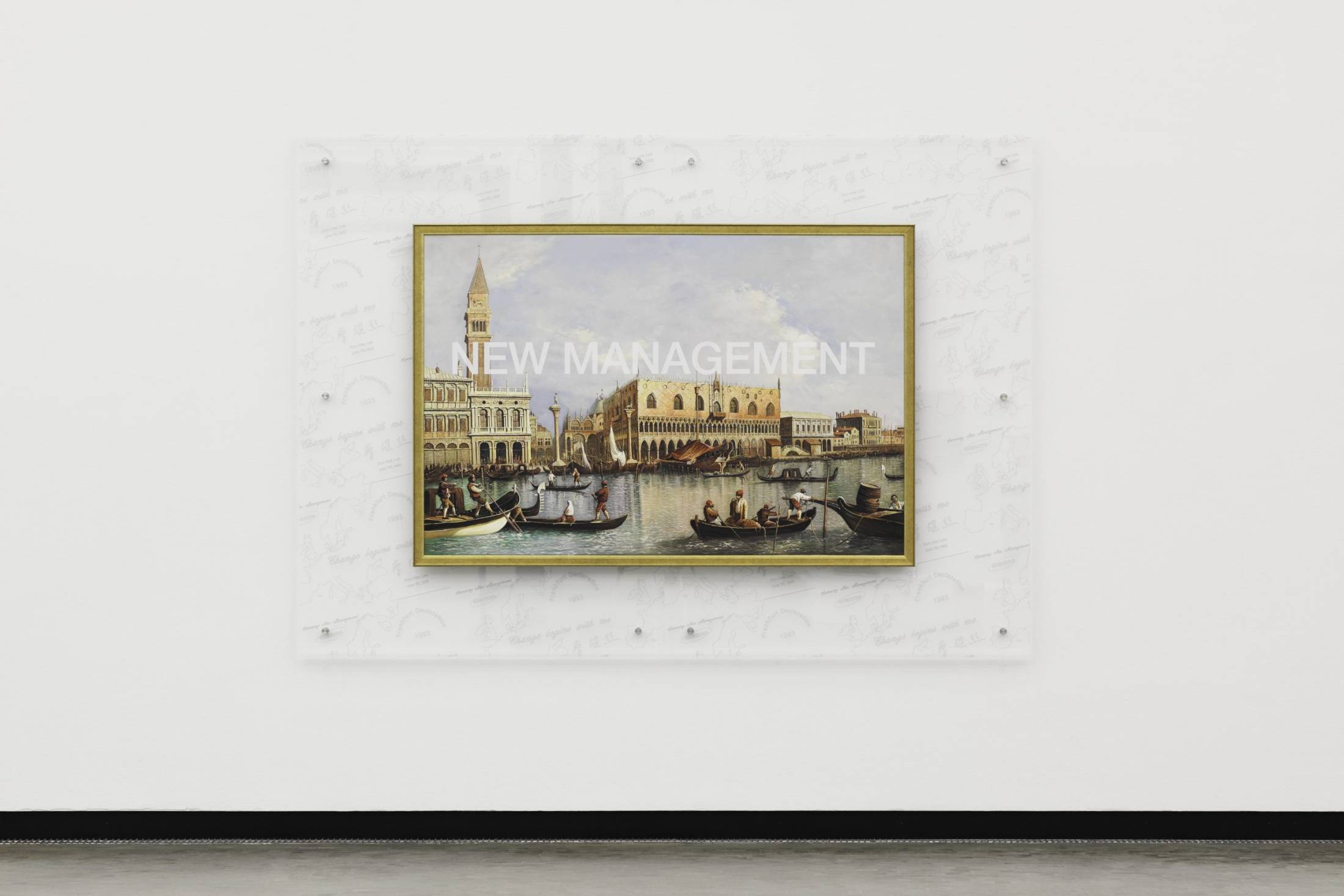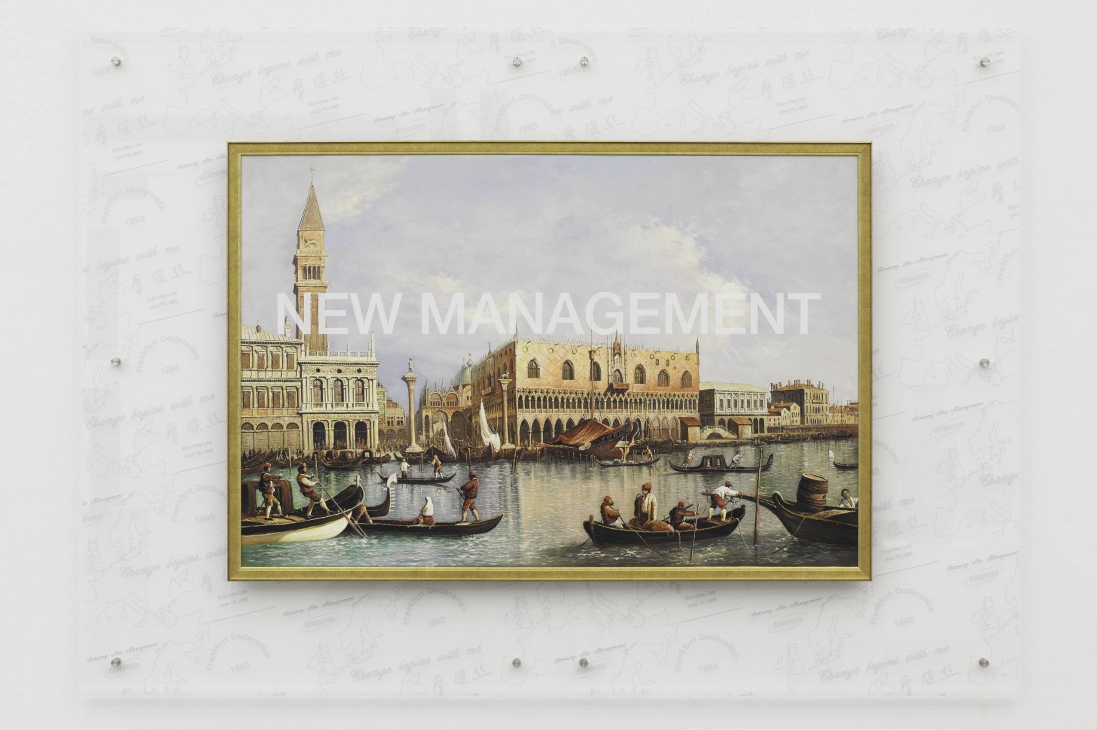Frankfurt Declaration Memorial Panels 2 (Kempinski Gravenbruch); 2014; Replica of acrylic Canaletto oil painting by Din Masson from Xiamen, China, screenprint, gilded frame, digital prints on acrylic glass, stainless steel spacers: 200×280×55cm.