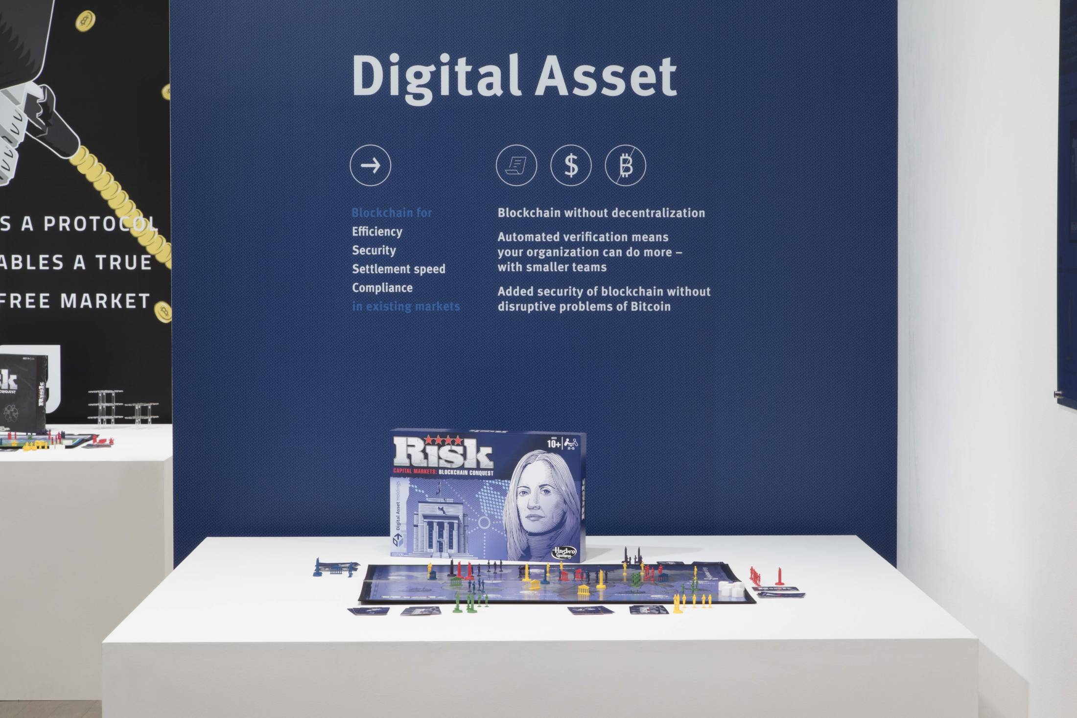 Blockchain Risk Board Game Prototype: Capital Markets Digital Asset Edition [1:1 Travel Release]; 2016; Game board: plywood, canvas, UV print on vinyl, Small board componets: plywood, canvas, UV print on vinyl Boardgame box: plywood, UV print on vinyl game figures, cards and dice: Spraypaint on, 3D printed figures, coins, plexiglas, digital print on cardboard: 100×100×4cm.