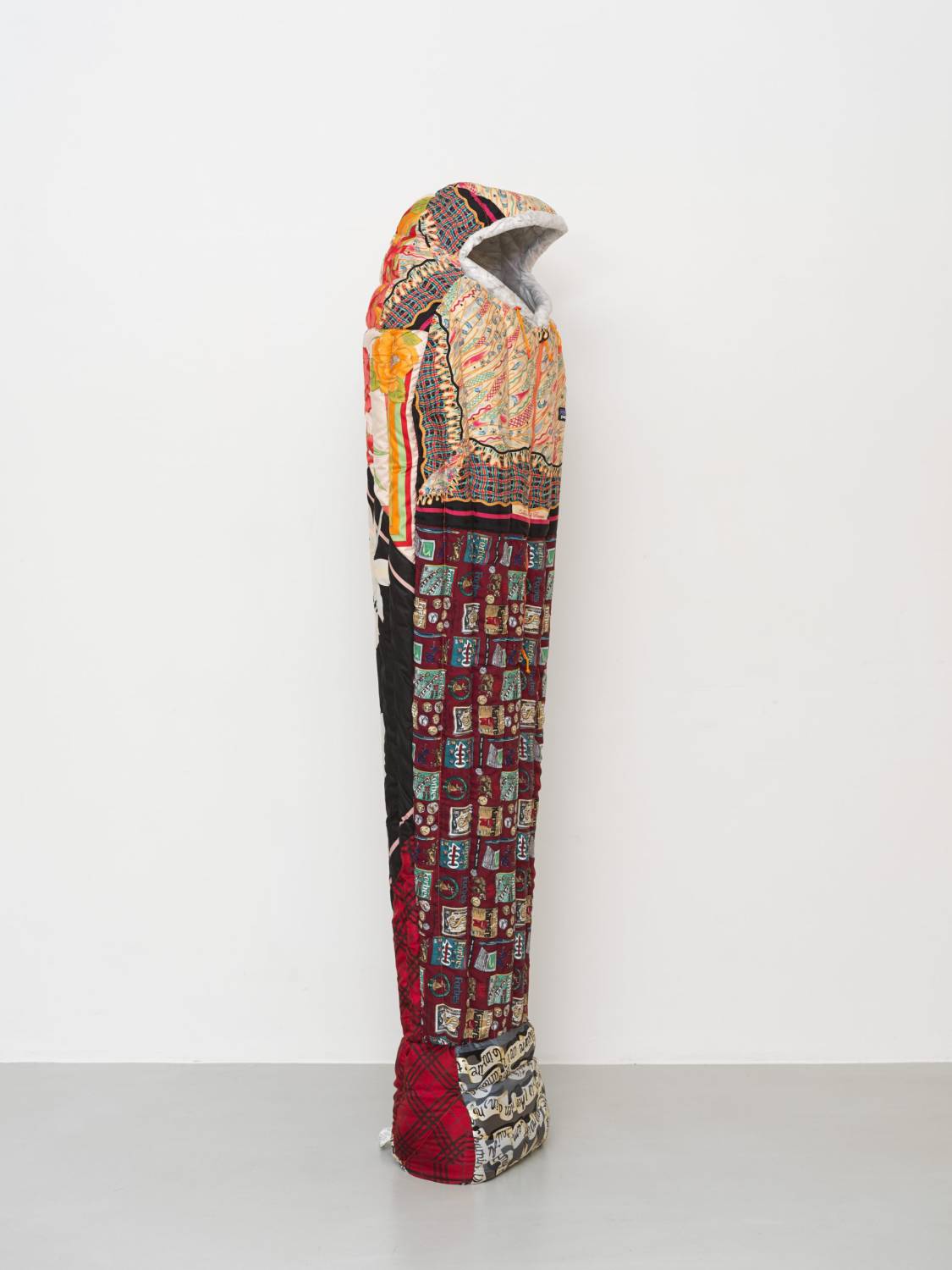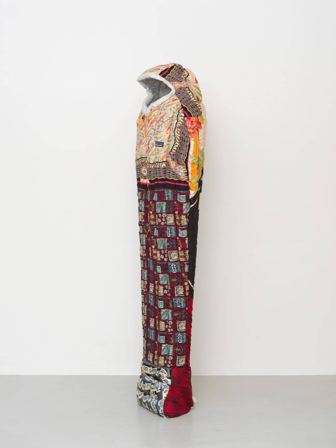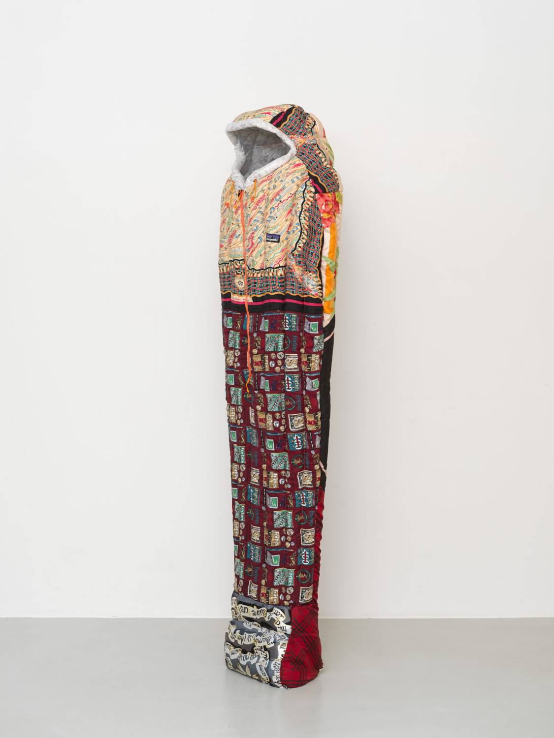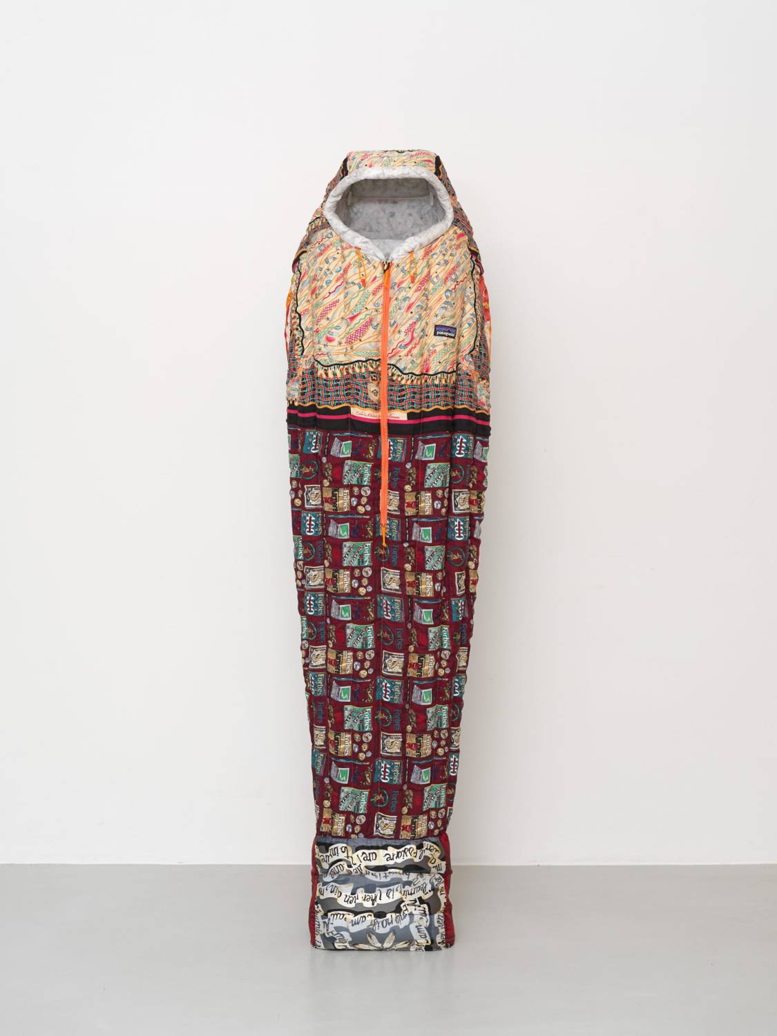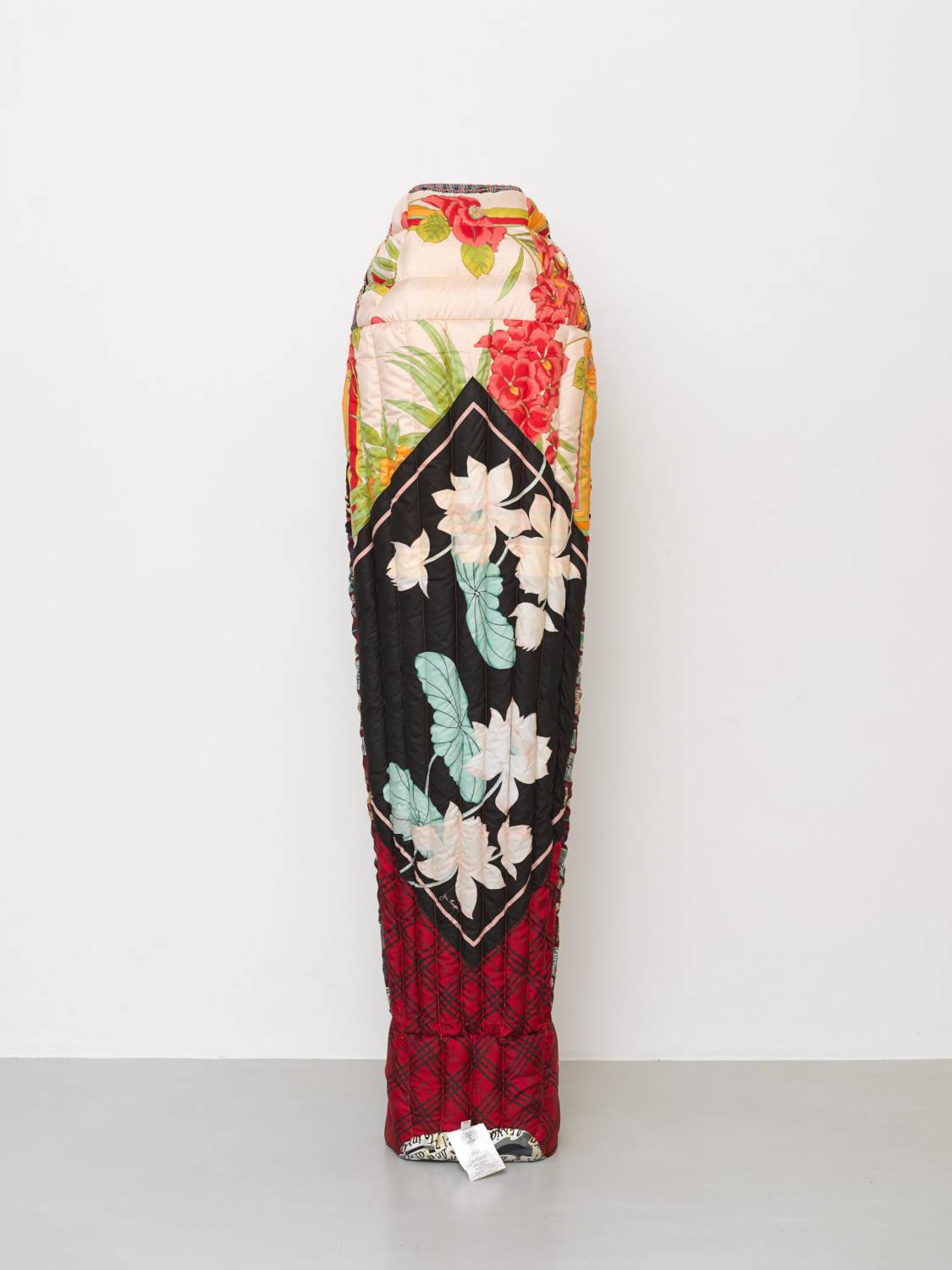 Remainder 1; 2019; Margaret Thatcher scarves, Patagonia 850 Down Sleeping Bag 30 F/-1 C - R parts, Ripstop Nylon, Down sourced from second hand San Francisco garments, carbon fibre, glass fibre, wood: 210×55×40cm.