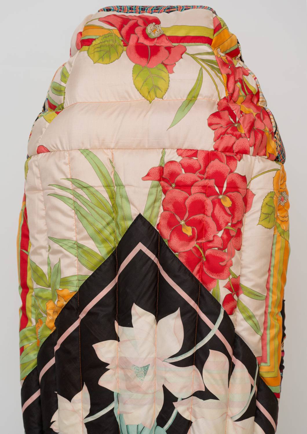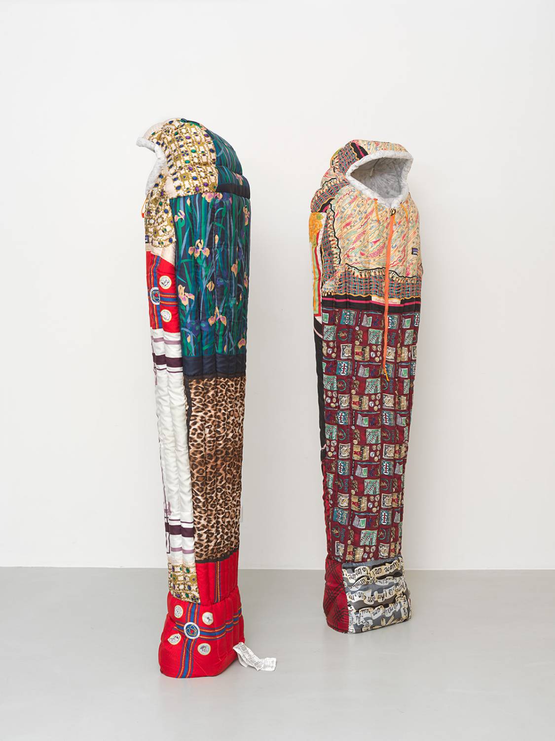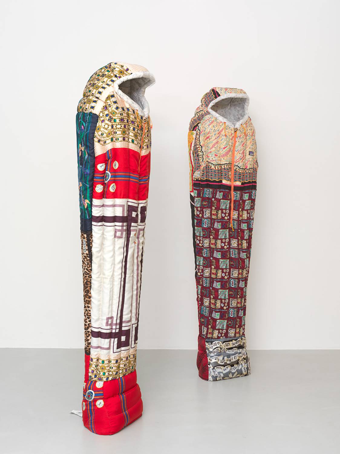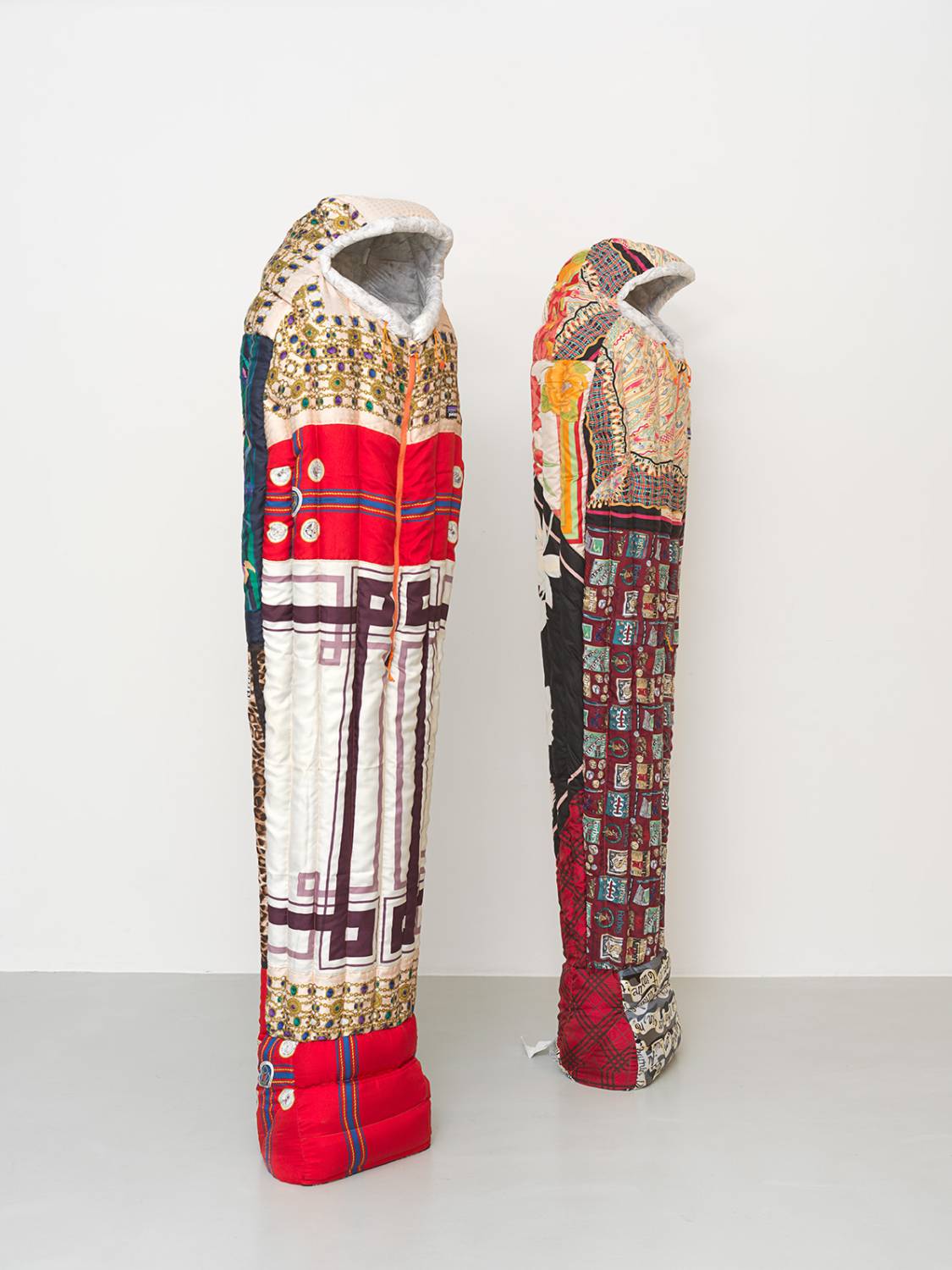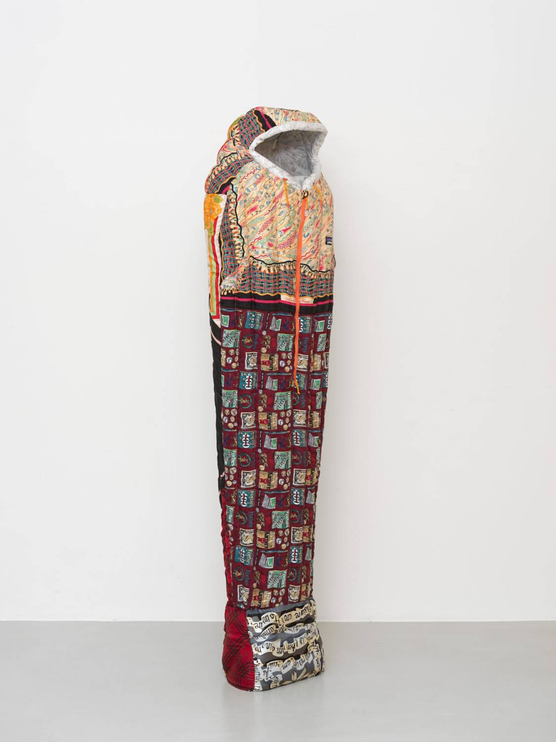 Remainder 1; 2019; Margaret Thatcher scarves, Patagonia 850 Down Sleeping Bag 30 F/-1 C - R parts, Ripstop Nylon, Down sourced from second hand San Francisco garments, carbon fibre, glass fibre, wood: 210×55×40cm.