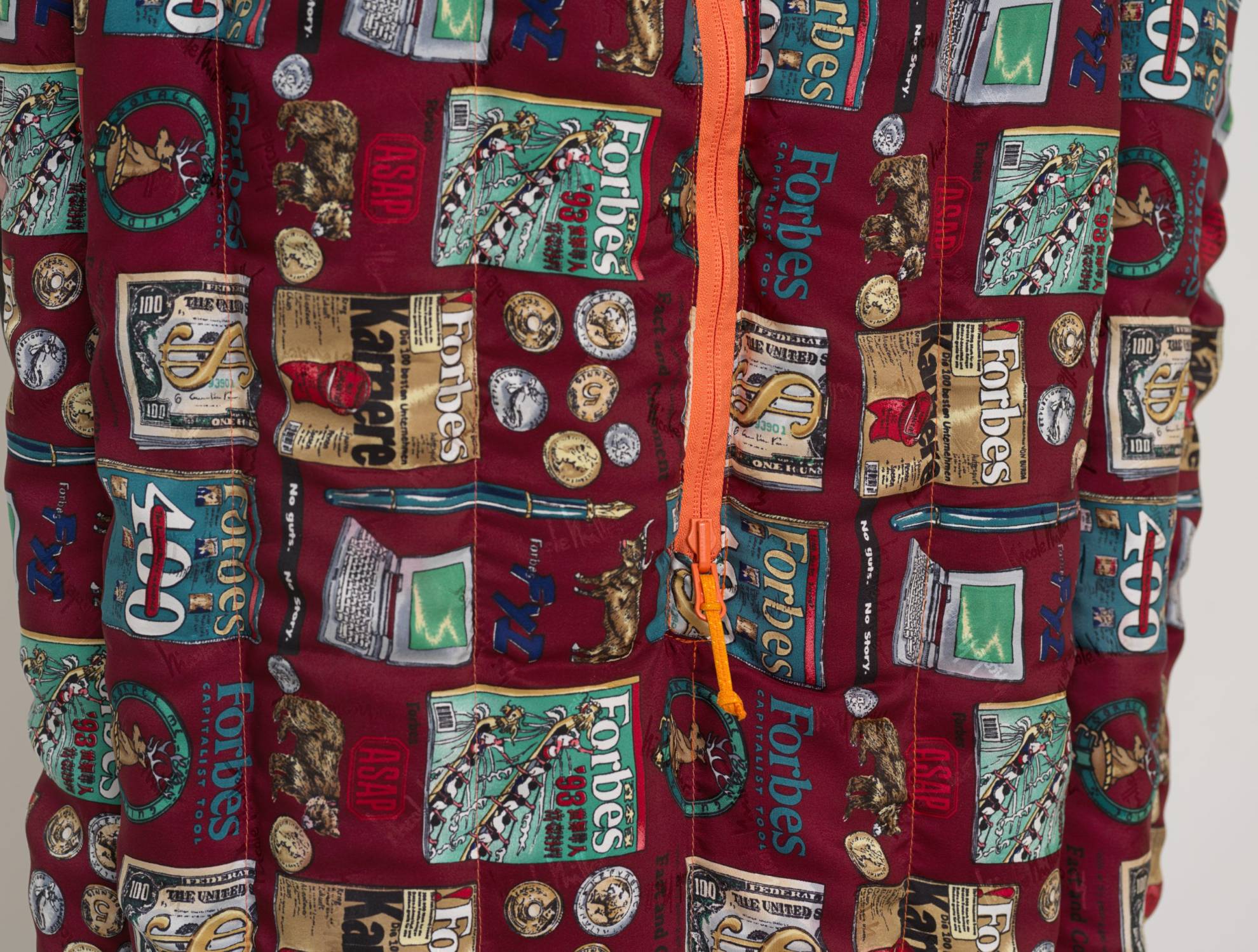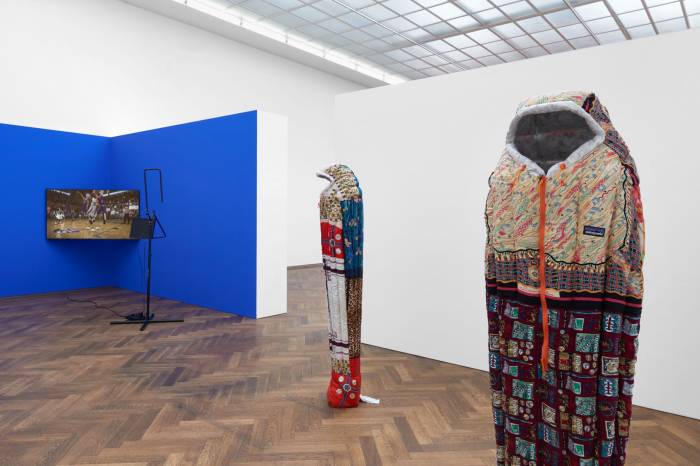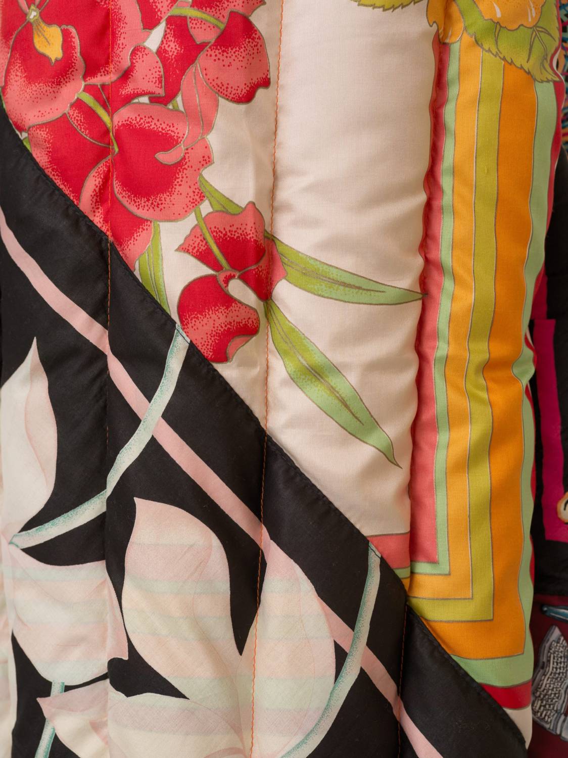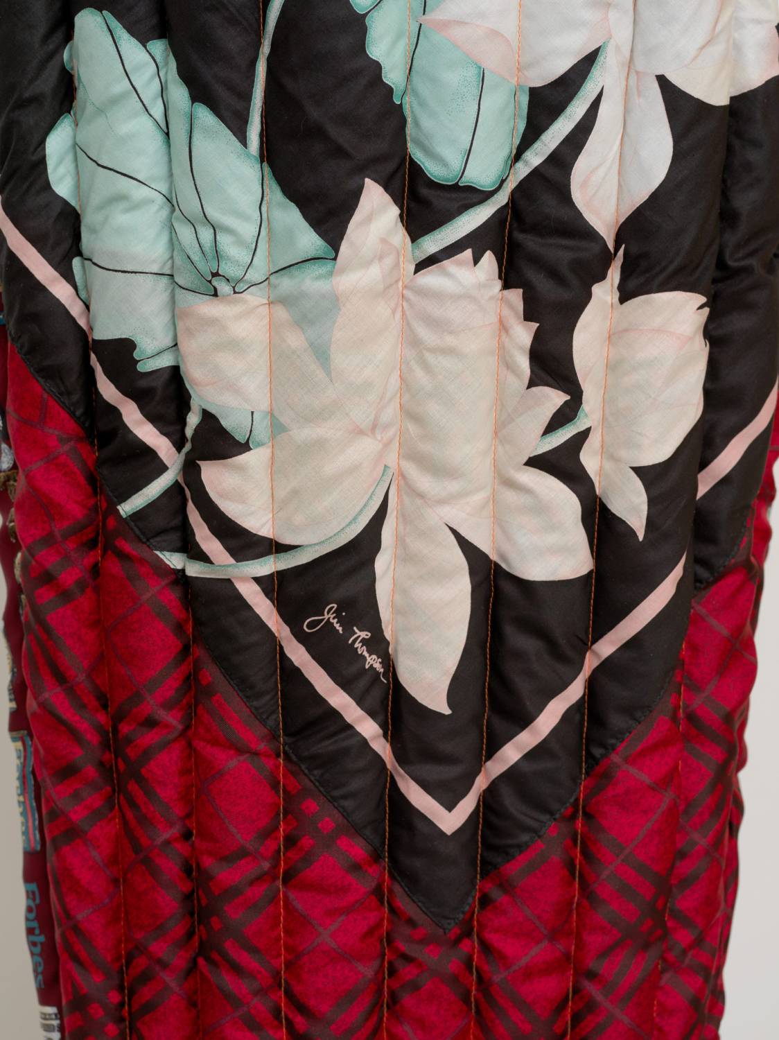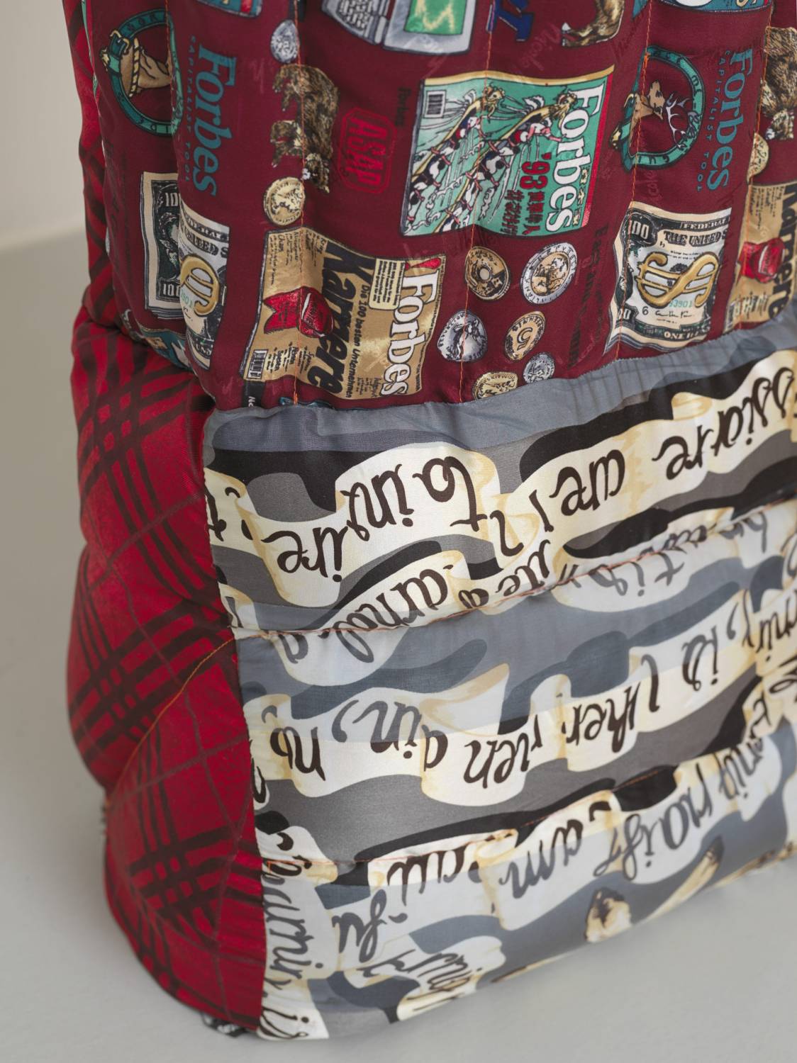 Remainder 1; 2019; Margaret Thatcher scarves, Patagonia 850 Down Sleeping Bag 30 F/-1 C - R parts, Ripstop Nylon, Down sourced from second hand San Francisco garments, carbon fibre, glass fibre, wood: 210×55×40cm.