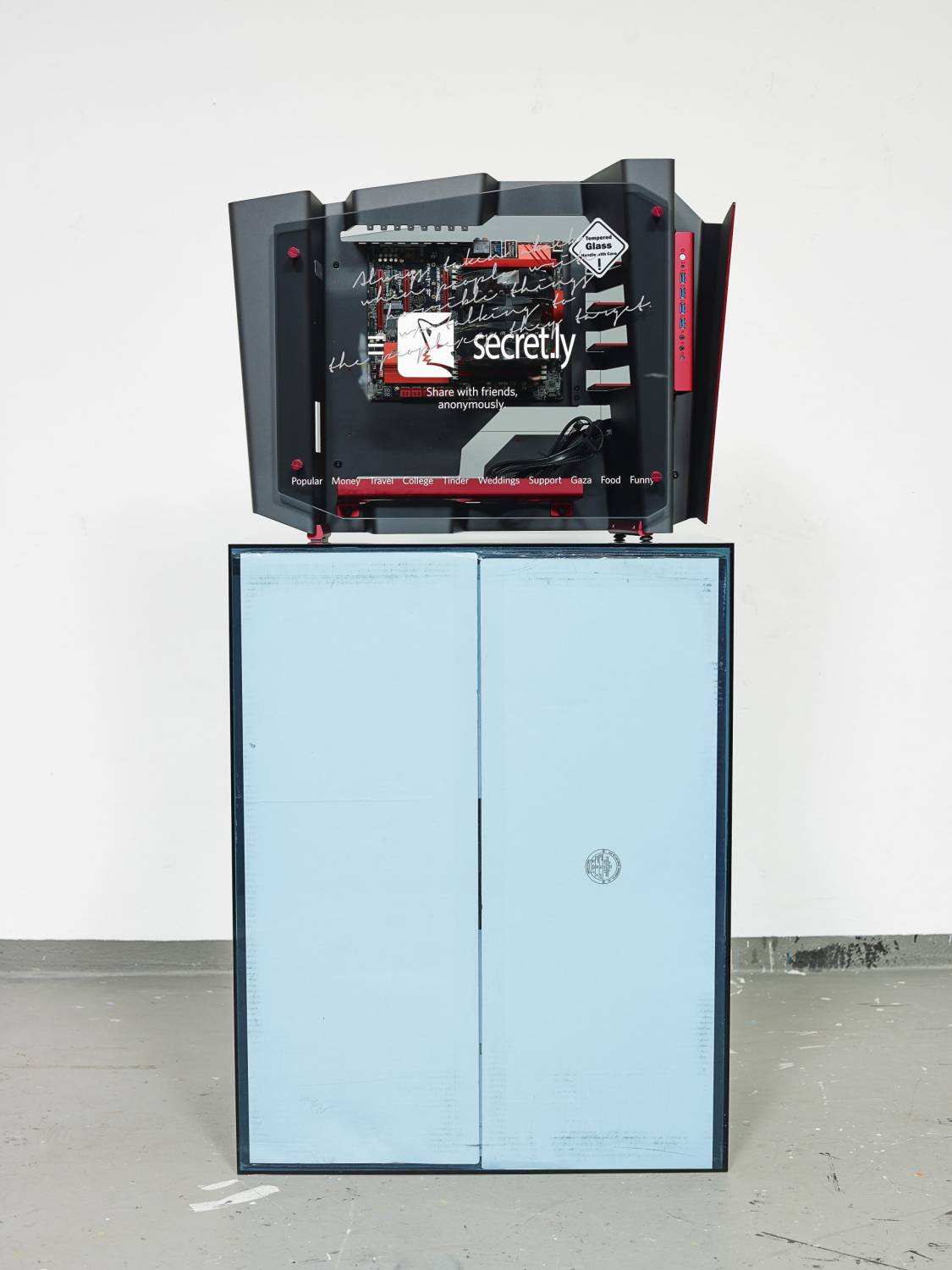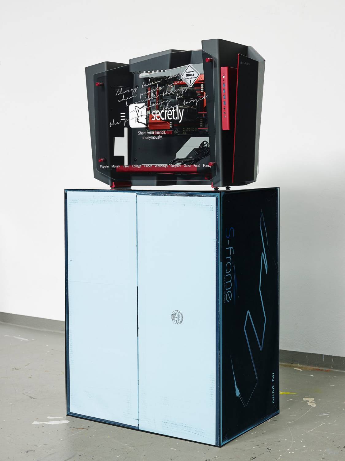 Berlin Startup Case Mod: Secret; 2014; Digital print on In-Win S-Frame open air chassis PC case and packaging, custom gaming hardware (motherboard, cooler), plexiglas: 148×72×46cm.