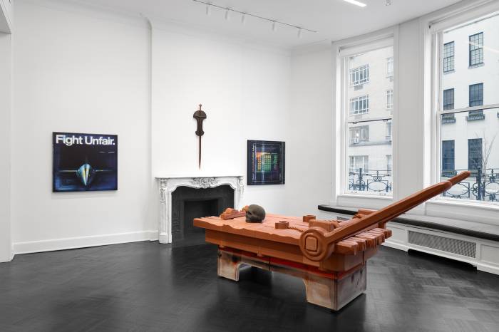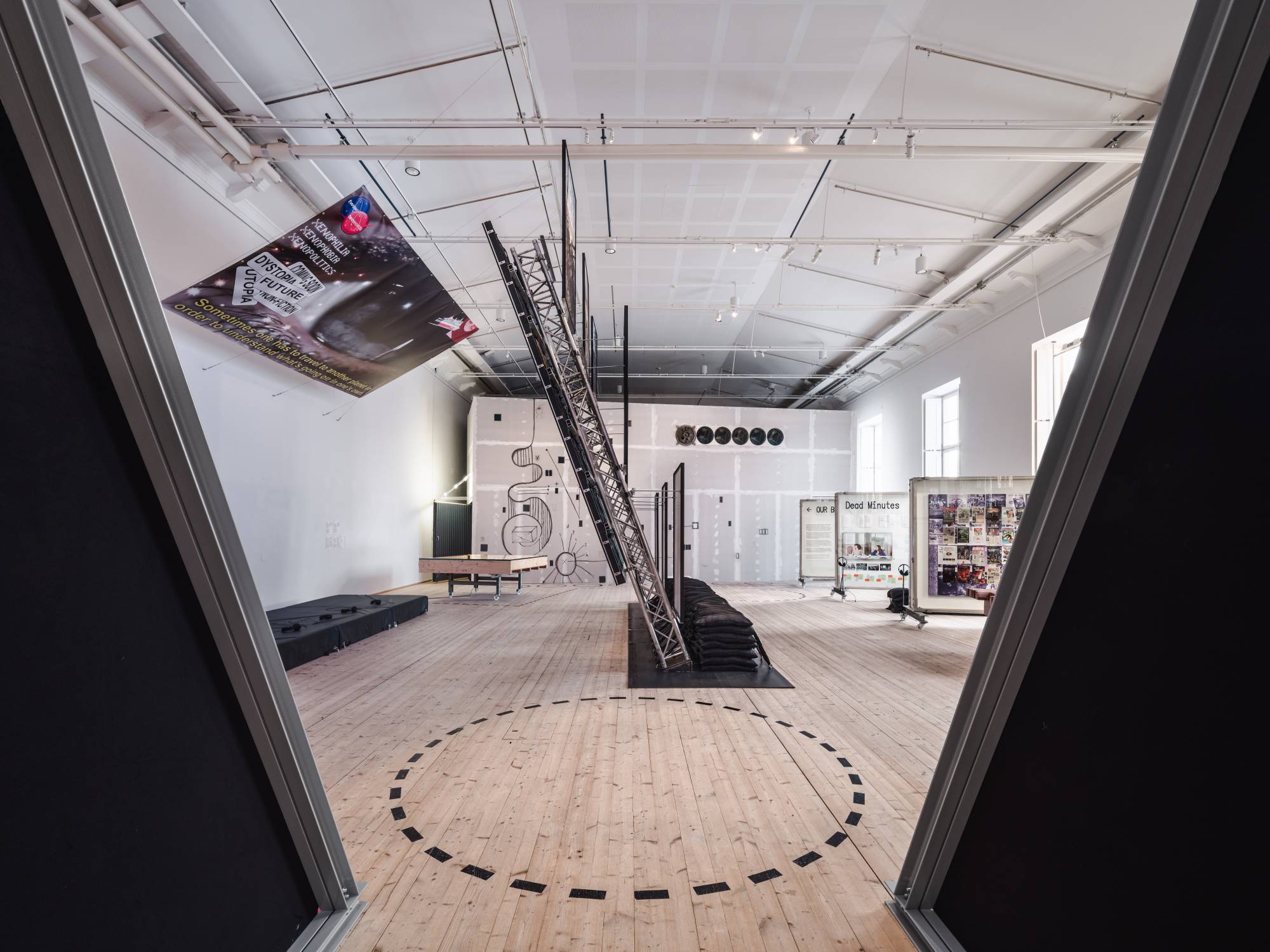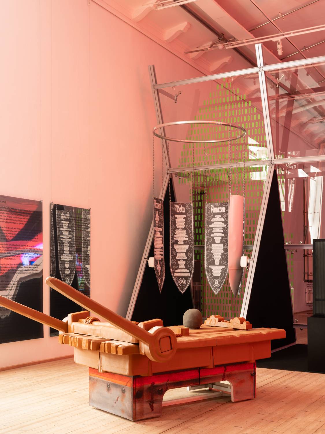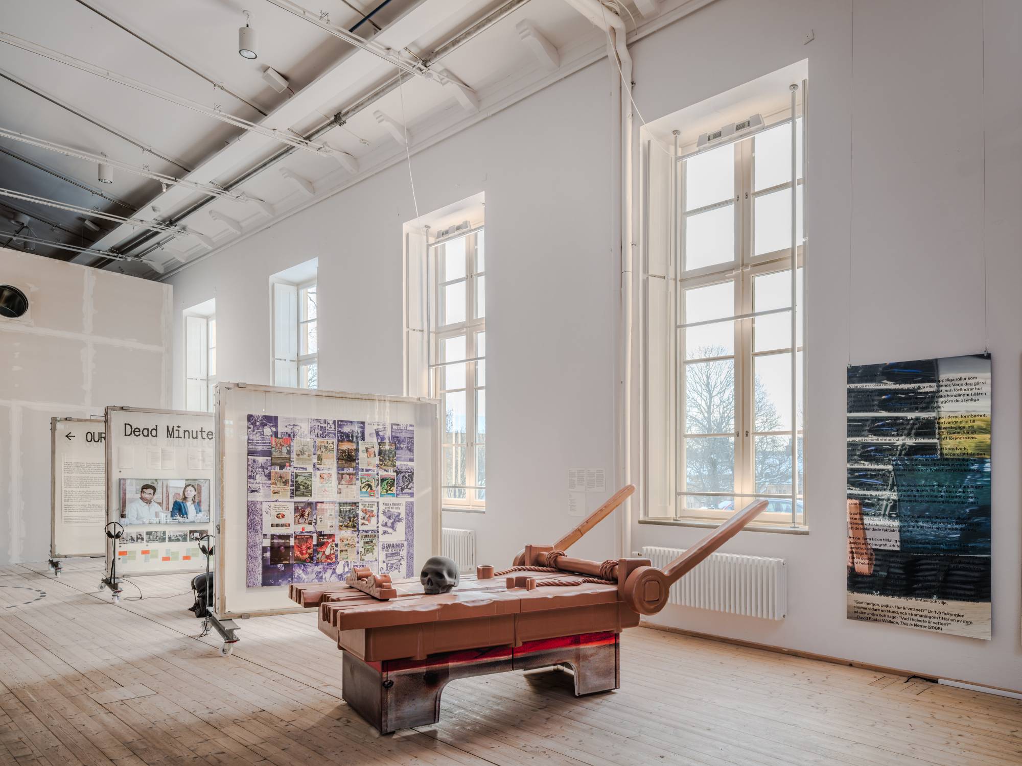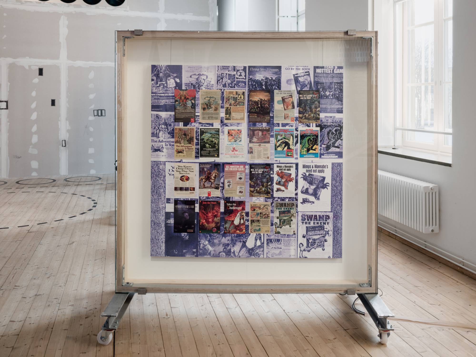 Detail of Simon Denny, ‘Dungeon artifact 2: Heroquest rack’, 2024; ‘Dungeon map 8: Dungeons & Dragons gaming advertisements 1980s–2010s’, 2024. Worldglimpsing: Roleplay and the Design of Alternate Realities, 2025. Courtesy of ArkDes × Nieuwe Instituut. Photo: Jean-Baptiste Béranger. 2026.