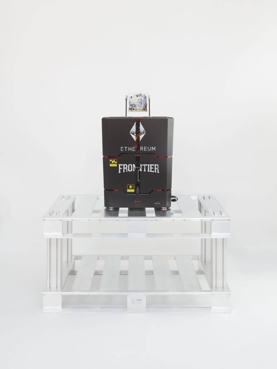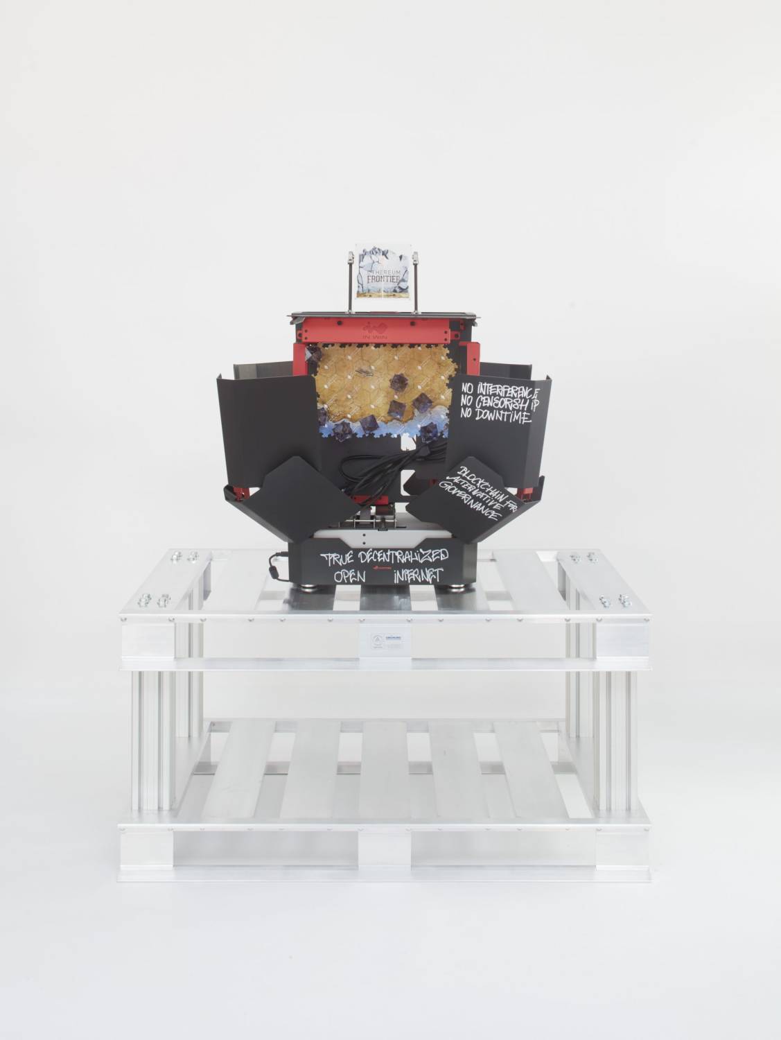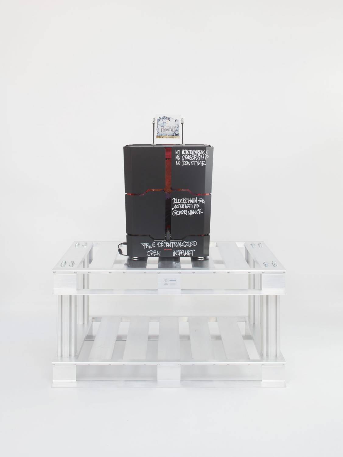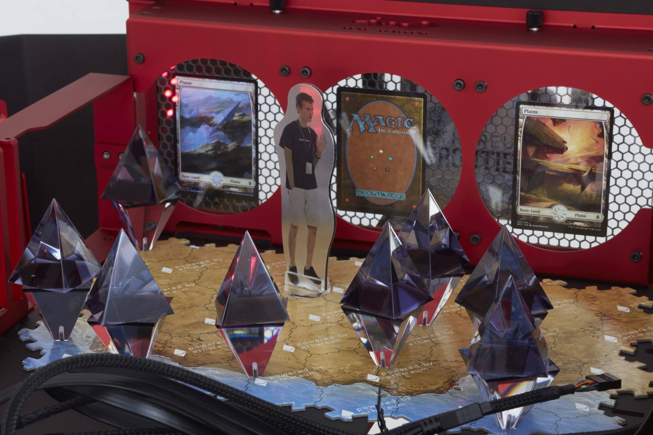 Zug Blockchain Startup Case Mod: Ethereum, Tribal; 2016; IN WIN H-Tower, aluminum palettes, aluminum profiles, UV print on Hasbro B2606100 Magic: The Gathering board game, laser-cut plexiglas, UV print on Aludibond cutout, steel bearing, powdercoated steel components: 143×120×80cm.