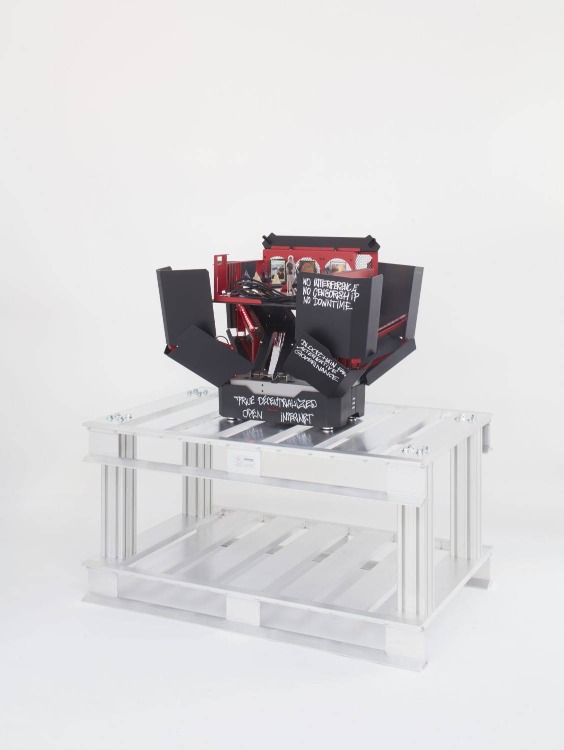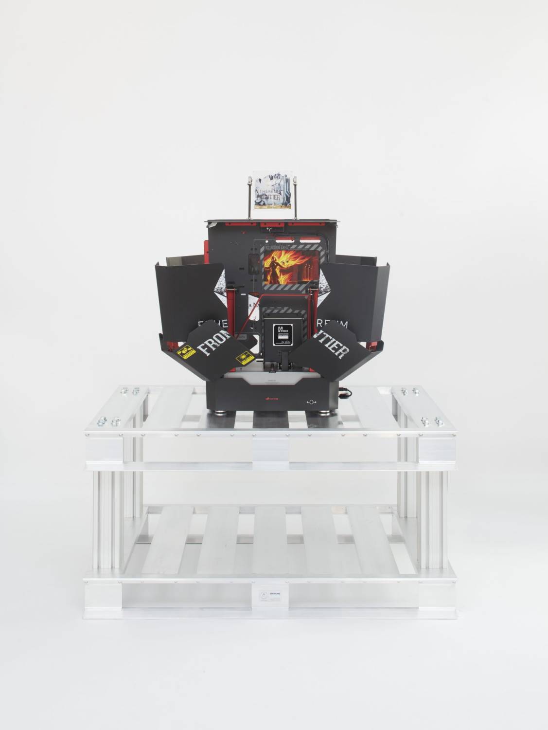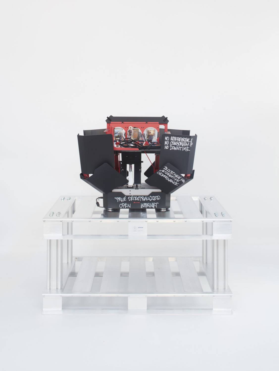 Zug Blockchain Startup Case Mod: Ethereum, Tribal; 2016; IN WIN H-Tower, aluminum palettes, aluminum profiles, UV print on Hasbro B2606100 Magic: The Gathering board game, laser-cut plexiglas, UV print on Aludibond cutout, steel bearing, powdercoated steel components: 143×120×80cm.