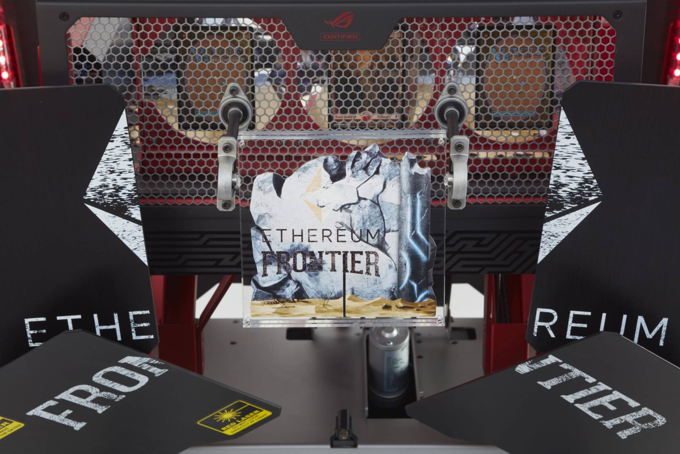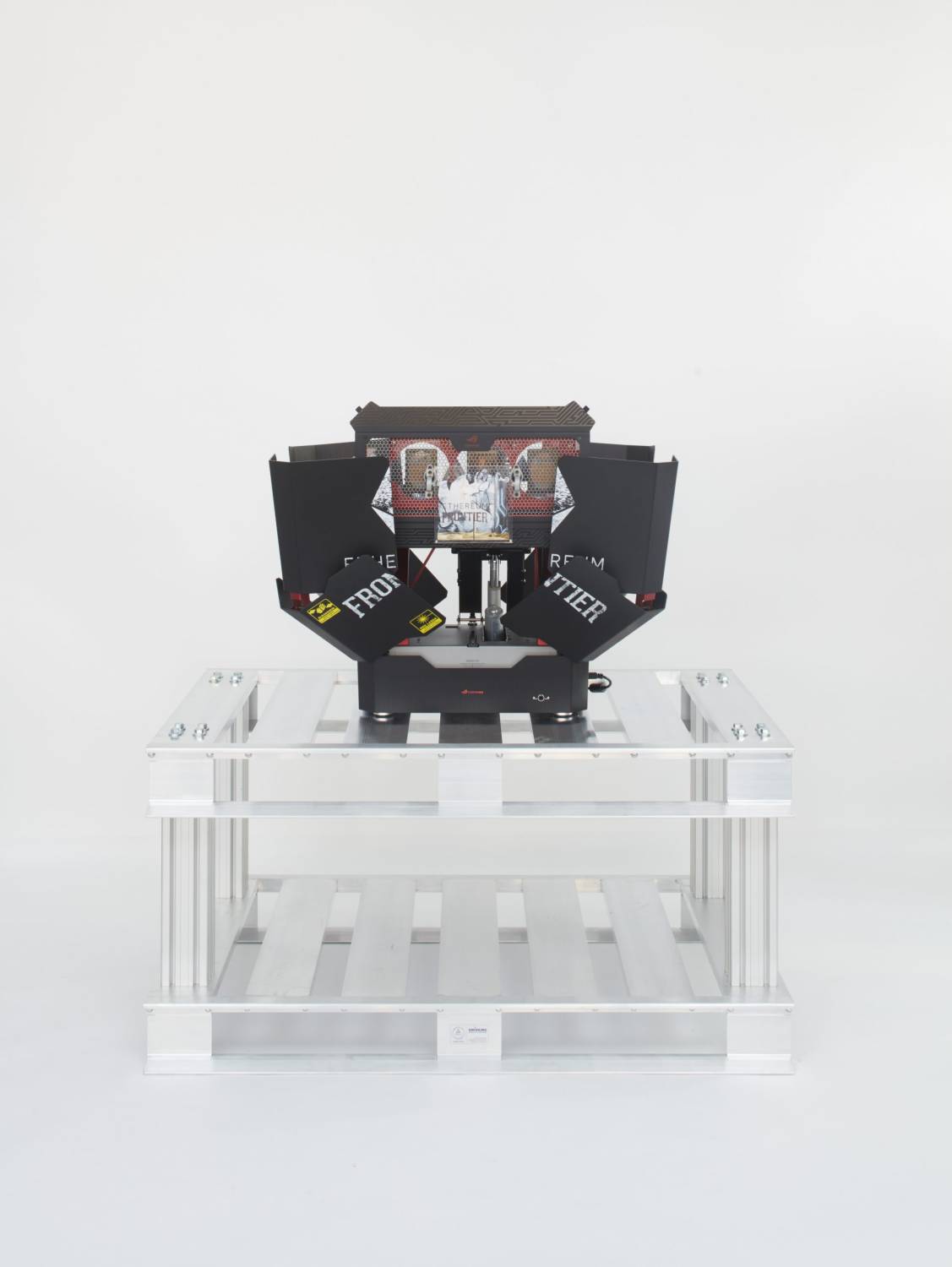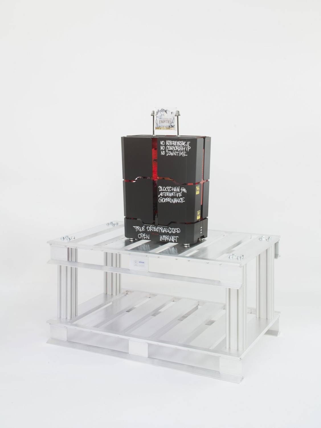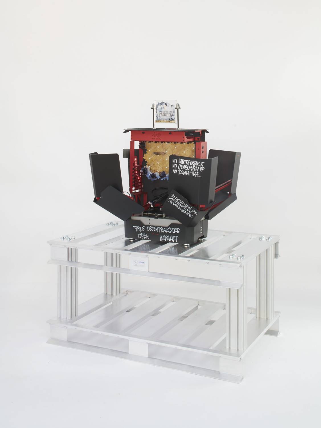 Zug Blockchain Startup Case Mod: Ethereum, Tribal; 2016; IN WIN H-Tower, aluminum palettes, aluminum profiles, UV print on Hasbro B2606100 Magic: The Gathering board game, laser-cut plexiglas, UV print on Aludibond cutout, steel bearing, powdercoated steel components: 143×120×80cm.